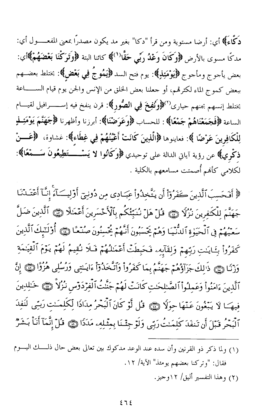 (أَفَحَسِبَ الَّذِينَ كَفَرُوا أَنْ يَتَّخِذُوا عِبَادِي مِنْ دُونِي أَوْلِيَاءَ إِنَّا أَعْتَدْنَا جَهَنَّمَ لِلْكَافِرِينَ نُزُلًا (102) قُلْ هَلْ نُنَبِّئُكُمْ بِالْأَخْسَرِينَ أَعْمَالًا (103) الَّذِينَ ضَلَّ سَعْيُهُمْ فِي الْحَيَاةِ الدُّنْيَا وَهُمْ يَحْسَبُونَ أَنَّهُمْ يُحْسِنُونَ صُنْعًا (104) أُولَئِكَ الَّذِينَ كَفَرُوا بِآيَاتِ رَبِّهِمْ وَلِقَائِهِ فَحَبِطَتْ أَعْمَالُهُمْ فَلَا نُقِيمُ لَهُمْ يَوْمَ الْقِيَامَةِ وَزْنًا (105) ذَلِكَ جَزَاؤُهُمْ جَهَنَّمُ بِمَا كَفَرُوا وَاتَّخَذُوا آيَاتِي وَرُسُلِي هُزُوًا (106) إِنَّ الَّذِينَ آمَنُوا وَعَمِلُوا الصَّالِحَاتِ كَانَتْ لَهُمْ جَنَّاتُ الْفِرْدَوْسِ نُزُلًا (107) خَالِدِينَ فِيهَا لَا يَبْغُونَ عَنْهَا حِوَلًا (108) قُلْ لَوْ كَانَ الْبَحْرُ مِدَادًا لِكَلِمَاتِ رَبِّي لَنَفِدَ الْبَحْرُ قَبْلَ أَنْ تَنْفَدَ كَلِمَاتُ رَبِّي وَلَوْ جِئْنَا بِمِثْلِهِ مَدَدًا (109) قُلْ إِنَّمَا أَنَا بَشَرٌ