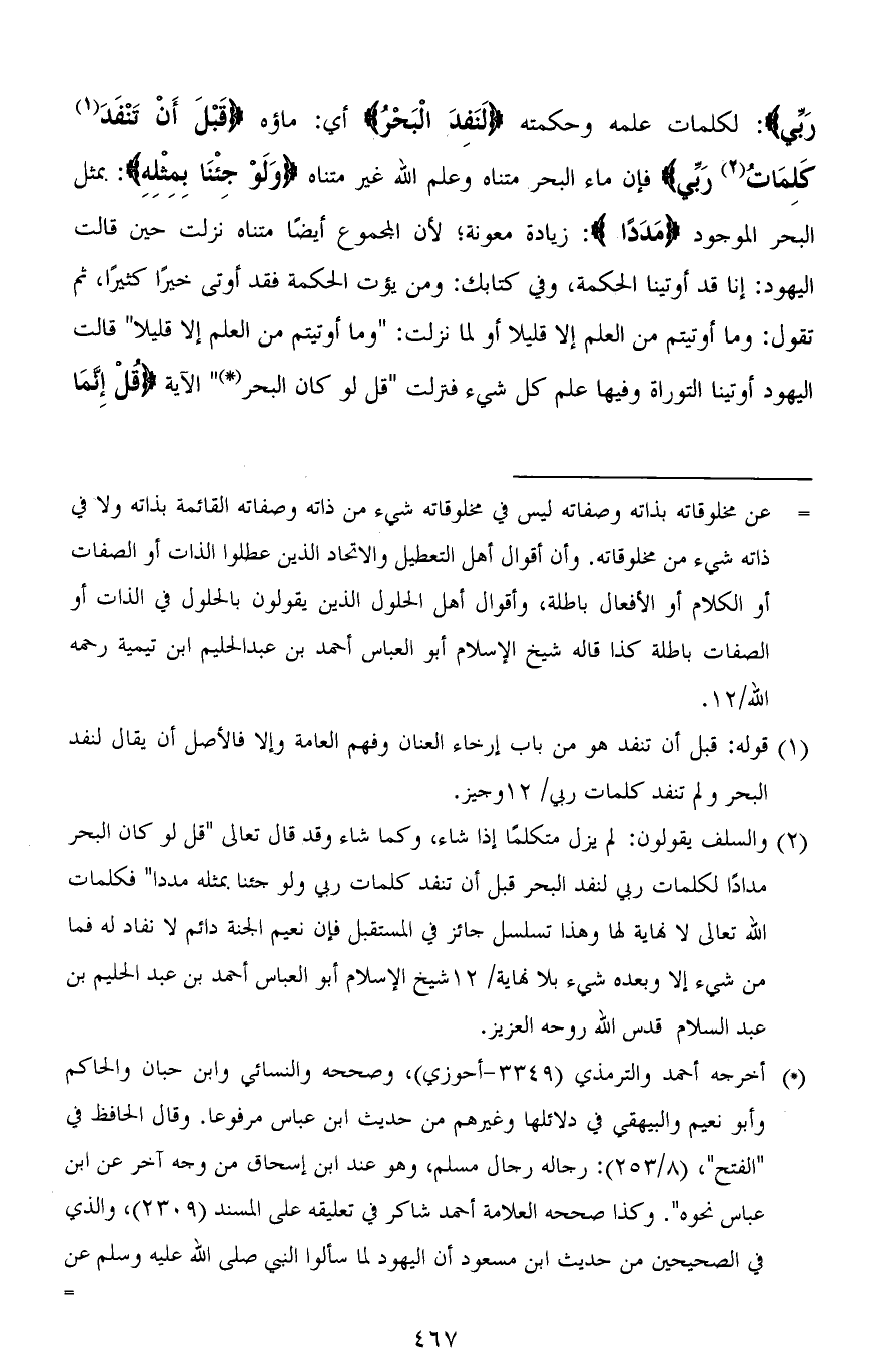 رَبِّي): لكلمات علمه وحكمته (لَنَفِدَ الْبَحْرُ) أي: ماؤه (قَبْلَ أَنْ تَنْفَدَ كَلِمَاتُ رَبِّي) فإن ماء البحر متناه وعلم الله غير متناه (وَلَوْ جِئْنَا بِمِثْلِهِ): بمثل البحر الموجود (مَدَدًا): زيادة معونة؛ لأن المجموع أيضًا متناه نزلت حين قالت اليهود: إنا قد أوتينا الحكمة، وفي كتابك: ومن يؤت الحكمة فقد أوتي خيرًا كثيرًا، ثم تقول: وما أوتيتم من العلم إلا قليلاً أو لما نزلت: " وما أوتيتم من العلم إلا قليلاً " قالت اليهود أوتينا التوراة وفيها علم كل شيء فنزلت " قل لو كان البحر " الآية (قُلْ إِنَّمَا