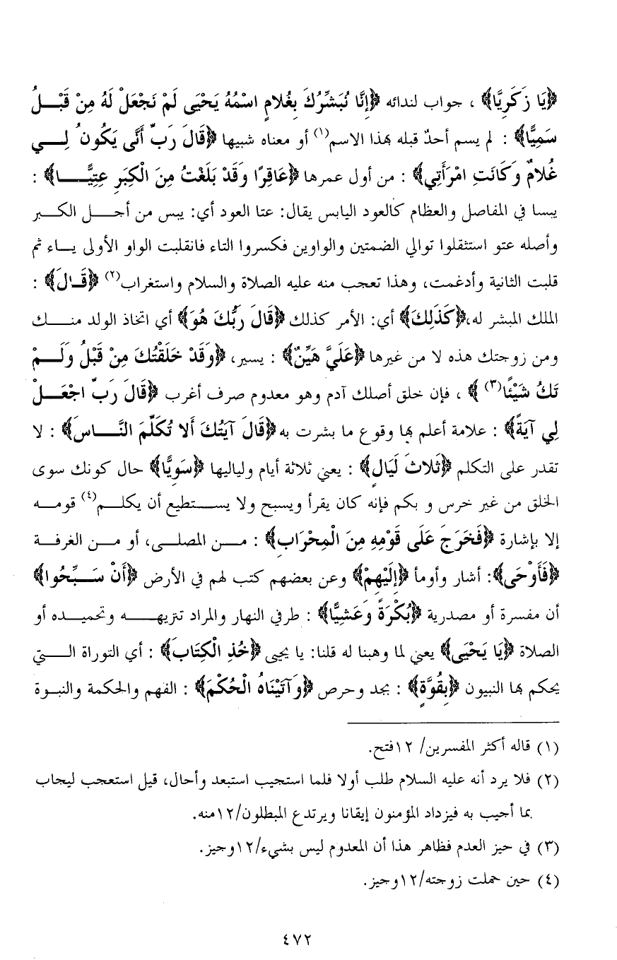 (يَا زَكَرِيَّا)، جواب لندائه (إِنَّا نُبَشِّرُكَ بِغُلَامٍ اسْمُهُ يَحْيَى لَمْ نَجْعَلْ لَهُ مِنْ قَبْلُ سَمِيًّا): لم يسم أحدٌ قبله بهذا الاسم أو معناه شبيهًا (قَالَ رَبِّ أَنَّى يَكُونُْ لِي غُلامٌ وَكَانَتِ امْرَأَتِي): من أول عمرها (عَاقِرًا وَقَدْ بَلَغتُ مِنَ الْكِبَرِ عِتِيًّا): يبسا في المفاصل والعظام كالعود اليابس يقال: عتا العود أي: يبس من أجل الكبر وأصله عتو استثقلوا توالي الضمتين والواوين فكسروا التاء فانقلبت الواو الأولى ياء ثم قلبت الثانية وأدغمت، وهذا تعجب منه عليه الصلاة والسلام واستغراب (قالَ): الملك المبشر له، (كَذَلِكَ) أي: الأمر كذلك (قَالَ ربُّكَ هُوَ) أي اتخاذ الولد منك ومن زوجتك هذه لا من غيرها (عَلَيَّ هَيِّنٌ): يسير، (وَقَدْ خَلَقْتُكَ مِنْ قَبْلُ وَلَمْ تَكُ شَيْئًا)، فإن خلق أصلك آدم وهو معدوم صرف أغرب (قَالَ رَبِّ اجْعَلْ لِي آيةً): علامة أعلم بها وقوع ما بشرت به (قَالَ آيَتُكَ أَلَّا تُكَلِّمَ النَّاسَ): لا تقدر على التكلم (ثَلَاثَ لَيَالٍ): يعني ثلاثة أيام ولياليها (سَوِيًّا) حال كونك سوى الخلق من غير خرس وبكم فإنه كان يقرأ ويسبح ولا يستطيع أن يكلم قومه إلا بإشارة (فخَرَجَ عَلَى قَوْمِهِ مِنَ الْمِحْرَابِ): من المصلى، أو من الغرفة (فأَوْحَى): أشار وأومأ (إِلَيْهِم) وعن بعضهم كتب لهم في الأرض (أَنْ سَبِّحُوا) أن مفسرة أو مصدرية (بُكْرَةً وَعَشِيًّا): طرفي النهار والمراد تنزيهه وتحميده أو الصلاة (يَا يَحْيَى) يعني لما وهبنا له قلنا: يَا يَحْيَى (خُذِ الْكِتَابَ): أي التوراة التي يحكم بها النبيون (بِقُوَّةٍ): بجد وحرص (وَآتَيْنَاهُ الْحُكْمَ): الفهم والحكمة والنبوة