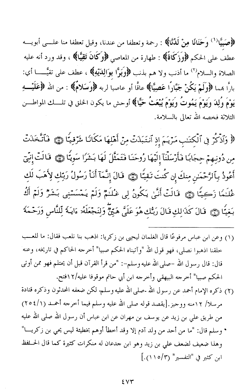صَبِيًّا وَحَنَانًا مِنْ لَدُنَّا): رحمة وتعطفا من عندنا، وقيل تعطفا منا على أبويه عطف على الحكم (وَزَكَاةً): طهارة من المعاصي (وَكَانَ تَقِيًّا)، وقد ورد أنه عليه الصلاة والسلام ما أذنب ولا هَمَّ بذنب (وَبَرًّا بِوَالِدَيهِ)، عطف على تَقِيًّا أي: بارًّا بهما (وَلَمْ يَكُنْ جَبَّارًا عَصِيًّا) عاقًّا أو عاصيًا لربه (وَسَلامٌ): من الله (عَلَيْهِ يَوْمَ وُلِدَ وَيَوْمَ يَمُوتُ وَيَوْمَ يُبْعَثُ حَيًّا) أوحش ما يكون الخلق في تلك المواطن الثلاثة فخصه الله تعالى بالسلامة.