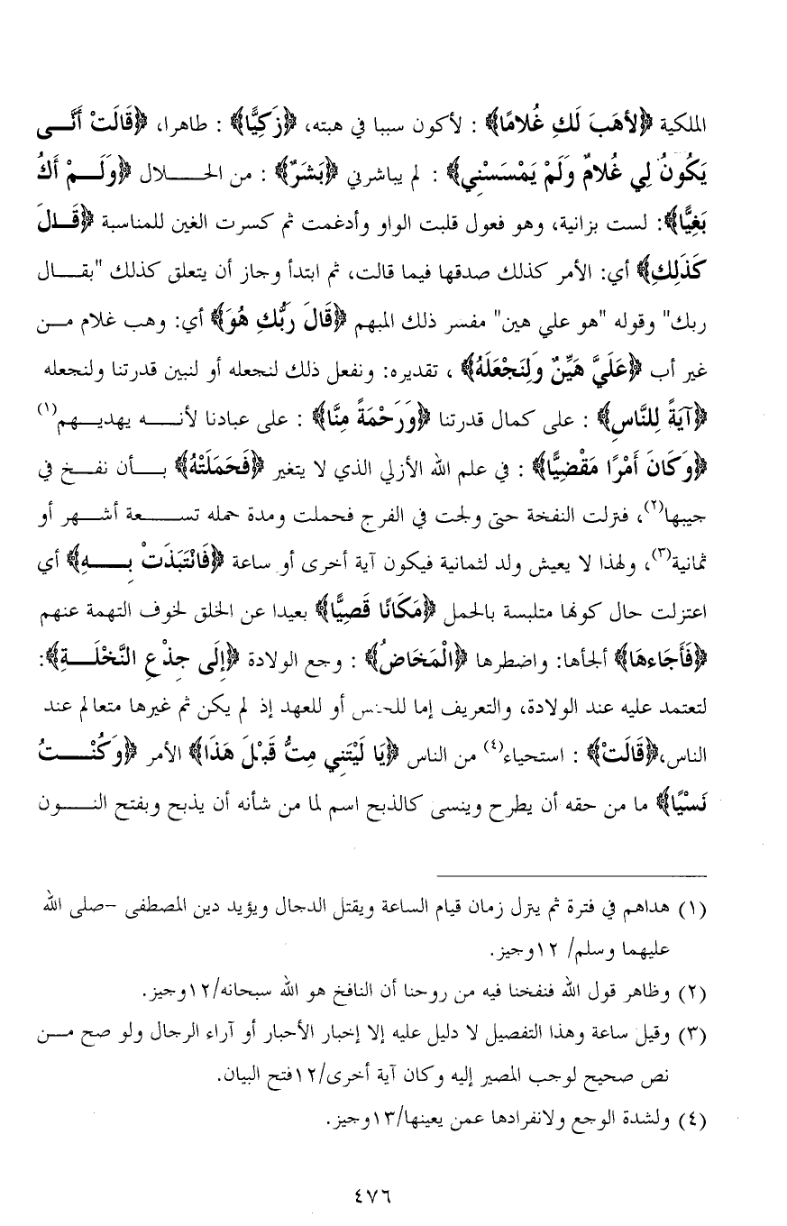 الملكية (لأهَبَ لَكِ غُلامًا): لأكون سببًا في هبته، (زَكِيًّا): طاهرًا، (قَالَتْ أَنَّى يَكُونُ لِي غُلَامٌ وَلَمْ يَمْسَسْنِي): لم يباشرني (بَشَرٌ): من الحلال (وَلَمْ أَكُ بَغِيًّا): لست بزانية، وهو فعول قلبت الواو وأدغمت ثم كسرت الغين للمناسبة (قالَ كَذَلِكِ) أي: الأمر كذلك صدقها فيما قالت، ثم ابتدأ وجاز أن يتعلق كذلك بـ " قال ربك " وقوله " هو على هين " مفسر ذلك المبهم (قَالَ رَبُّكِ هُوَ) أي: وهب غلام من غير أب (عَلَيَّ هَيِّنٌ وَلِنَجْعَلَهُ)، تقديره: ونفعل ذلك لنجعله أو لنبين قدرتنا ولنجعله (آيَةً لِلنَّاسِ): على كمال قدرتنا (وَرَحْمَةً مِنَّا): على عبادنا لأنه يهديهم (وَكَانَ أَمْرًا مَقْضِيًّا): في علم الله الأزلي الذي لا يتغير (فَحَمَلَتْهُ) بأن نفخ في جيبها، فنزلت النفخة حتى ولجت في الفرج فحملت ومدة حمله تسعة أشهر أو ثمانية، ولهذا لا يعيش ولد لثمانية فيكون آية أخرى أو ساعة (فانتَبَذَتْ بِهِ) أي اعتزلت حال كونها متلبسة بالحمل (مَكَانًا قَصِيًّا) بعيدًا عن الخلق لخوف التهمة عنهم (فأَجَاءهَا) ألجأها: واضطرها (الْمَخَاضُ): وجع الولادة (إِلَى جِذْعِ النَّخْلَةِ): لتعتمد عليه عند الولادة، والتعريف إما للجنس أو للعهد إذ لم يكن ثم غيرها متعالم عند الناس، (قَالَتْ): استحياء من الناس (يَا لَيْتَنِي مِتُّ قَبْلَ هَذَا) الأمر (وَكُنْتُ نَسْيًا) ما من حقه أن يطرح وينسى كالذبح اسم لما من شأنه أن يذبح وبفتح النون