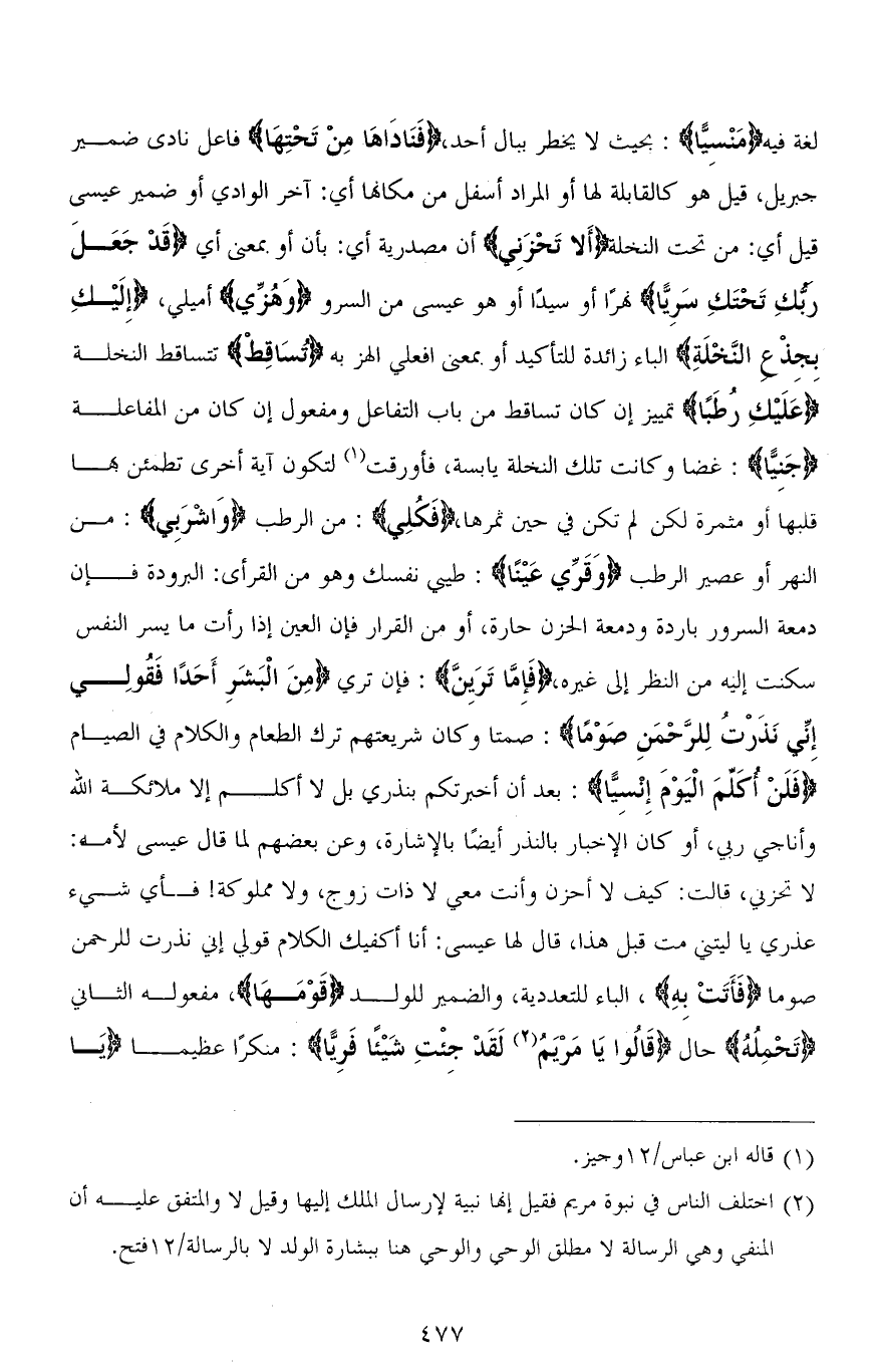 لغة فيه (مَنْسِيًّا)؛ بحيث لا يخطر ببال أحد، (فَنَادَاهَا مِنْ تَحْتِهَا) فاعل نادى ضمير جبريل، قيل هو كالقابلة لها أو المراد أسفل من مكانها أي: آخر الوادي أو ضمير عيسى قيل أي: من تحت النخلة (أَلَّا تَحْزَنِي) أن مصدرية أي: بأن أو بمعنى أي (قَدْ جَعَلَ ربُّكِ تَحْتَكِ سَرِيًّا) نهرًا أو سيدًا أو هو عيسى من السرو (وَهُزِّي) أميلي، (إِلَيْكِ بجِذْع النَّخْلَةِ) الباء زائدة للتأكيد أو بمعنى افعلي الهز به (تُسَاقِطْ) تتساقط النخلة (عَلَيْكِ رُطَبًا) تمييز إن كان تساقط من باب التفاعل ومفعول إن كان من المفاعلة (جَنِيًّا): غضًا وكانت تلك النخلة يابسة، فأورقت لتكون آية أخرى يطمئن بها قلبها أو مثمرة لكن لم تكن في حين ثمرها، (فَكُلِي): من الرطب (وَاشْرَبِي): من النهر أو عصير الرطب (وَقَرِّي عَيْنًا): طيبي نفسك وهو من القرأى: البرودة فإن دمعة السرور باردة ودمعة الحزن حارة، أو من القرار فإن العين إذا رأت ما يسر النفس سكنت إليه من النظر إلى غيره، (فإِمَّا تَرَيِنَّ): فإن تري (مِنَ الْبَشَرِ أَحَدًا فقُولِي إِنِّي نَذَرْتُ لِلرَّحْمَنِ صَوْمًا): صمتًا وكان شريعتهم ترك الطعام والكلام في الصيام (فَلَنْ أُكَلِّمَ الْيَوْمَ إِنْسِيًّا): بعد أن أخبركم بنذري بل لا أكلم إلا ملائكة الله وأناجي ربي، أو كان الإخبار بالنذر أيضًا بالإشارة، وعن بعضهم لما قال عيسى لأمه: لا تحزني، قالت: كيف لا أحزن وأنت معي لا ذات زوج، ولا مملوكة! فأي شيء عذري يا ليتني مت قبل هذا، قال لها عيسى: أنا أكفيك الكلام قولي إني نذرت للرحمن صومًا (فَأَتَتْ بِهِ)، الباء للتعدية، والضمير للولد (قَوْمَها)، مفعوله الثاني (تَحْمِلُهُ) حال (قَالُوا يَا مَرْيَمُ لَقَدْ جِئْتِ شَيْئًا فَرِيًّا): منكرًا عظيما (يَا