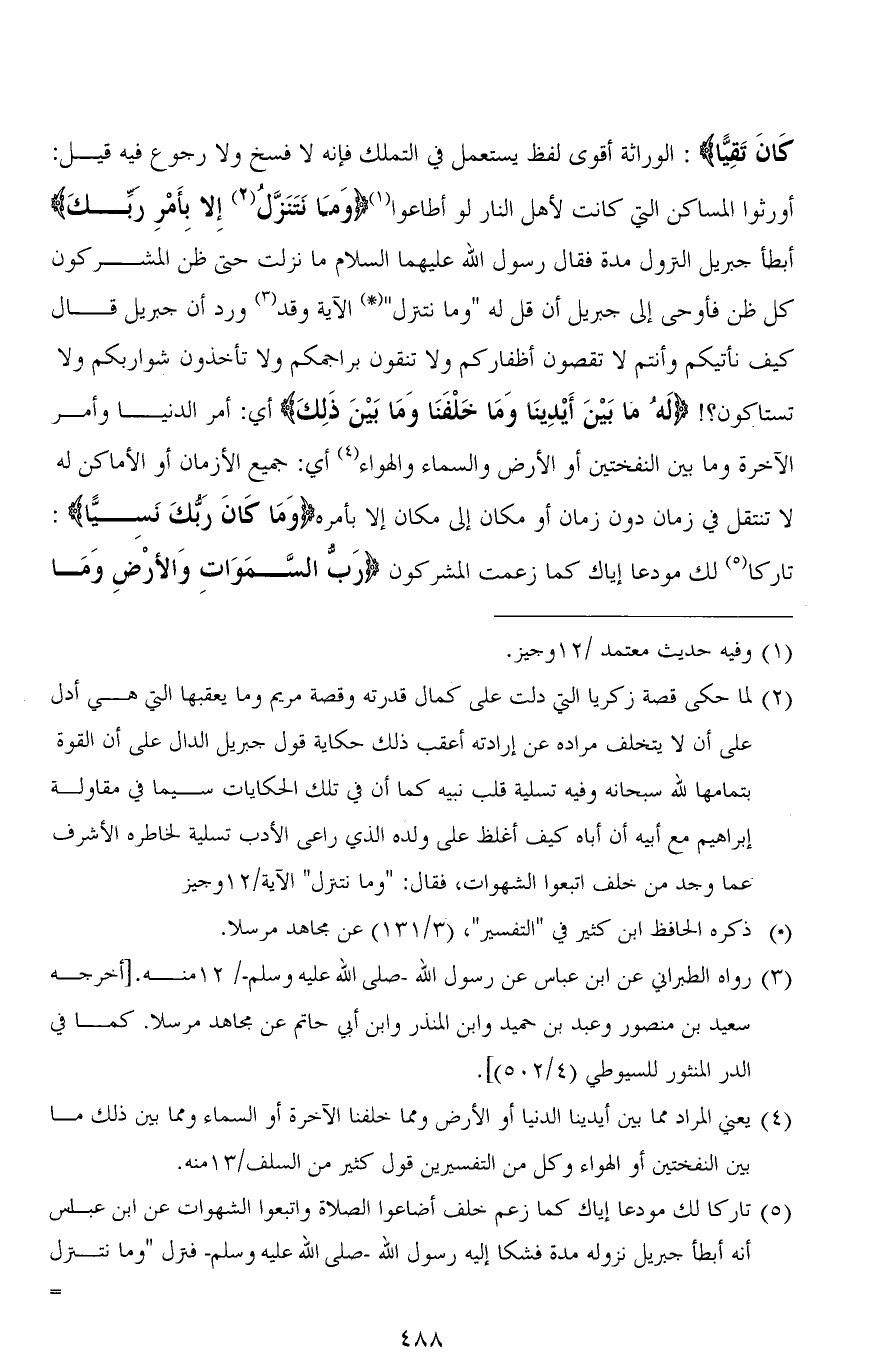 كَانَ تَقِيًّا): الوراثة أقوى لفظ يستعمل في التملك فإنه لا فسخ ولا رجوع فيه قيل: أورثوا المساكن التي كانت لأهل النار لو أطاعوا (وَمَا نَتَنَزَّلُ إِلَّا بِأَمْرِ رَبِّكَ) أبطأ جبريل النزول مدة فقال رسول الله عليهما السلام ما نزلت حتى ظن المشركون كل ظن فأوحى إلى جبريل أن قل له " وَمَا نَتَنَزَّلُ " الآية وقد ورد أن جبريل قال كيف نأتيكم وأنتم لا تقصون أظفاركم ولا تنقون براجمكم ولا تأخذون شواربكم ولا تستاكون؟! (لَهُ مَا بَيْنَ أَيْدِينَا وَمَا خَلْفَنَا وَمَا بَيْنَ ذَلِكَ) أي: أمر الدنيا وأمر الآخرة وما بين النفختين أو الأرض والسماء والهواء أي: جميع الأزمان أو الأماكن له لا تنتقل في زمان دون زمان أو مكان إلى مكان إلا بأمره (وَمَا كَانَ رَبُّكَ نَسِيًّا): تاركًا لك مودعًا إياك كما زعمت المشركون (رَبُّ السَّمَاوَاتِ وَالْأَرْضِ وَمَا