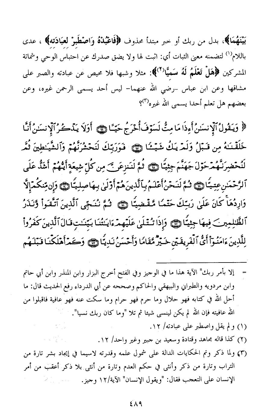 (وَيَقُولُ الْإِنْسَانُ أَإِذَا مَا مِتُّ لَسَوْفَ أُخْرَجُ حَيًّا (66) أَوَلَا يَذْكُرُ الْإِنْسَانُ أَنَّا خَلَقْنَاهُ مِنْ قَبْلُ وَلَمْ يَكُ شَيْئًا (67) فَوَرَبِّكَ لَنَحْشُرَنَّهُمْ وَالشَّيَاطِينَ ثُمَّ لَنُحْضِرَنَّهُمْ حَوْلَ جَهَنَّمَ جِثِيًّا (68) ثُمَّ لَنَنْزِعَنَّ مِنْ كُلِّ شِيعَةٍ أَيُّهُمْ أَشَدُّ عَلَى الرَّحْمَنِ عِتِيًّا (69) ثُمَّ لَنَحْنُ أَعْلَمُ بِالَّذِينَ هُمْ أَوْلَى بِهَا صِلِيًّا (70) وَإِنْ مِنْكُمْ إِلَّا وَارِدُهَا كَانَ عَلَى رَبِّكَ حَتْمًا مَقْضِيًّا (71) ثُمَّ نُنَجِّي الَّذِينَ اتَّقَوْا وَنَذَرُ الظَّالِمِينَ فِيهَا جِثِيًّا (72) وَإِذَا تُتْلَى عَلَيْهِمْ آيَاتُنَا بَيِّنَاتٍ قَالَ الَّذِينَ كَفَرُوا لِلَّذِينَ آمَنُوا أَيُّ الْفَرِيقَيْنِ خَيْرٌ مَقَامًا وَأَحْسَنُ نَدِيًّا (73) وَكَمْ أَهْلَكْنَا قَبْلَهُمْ