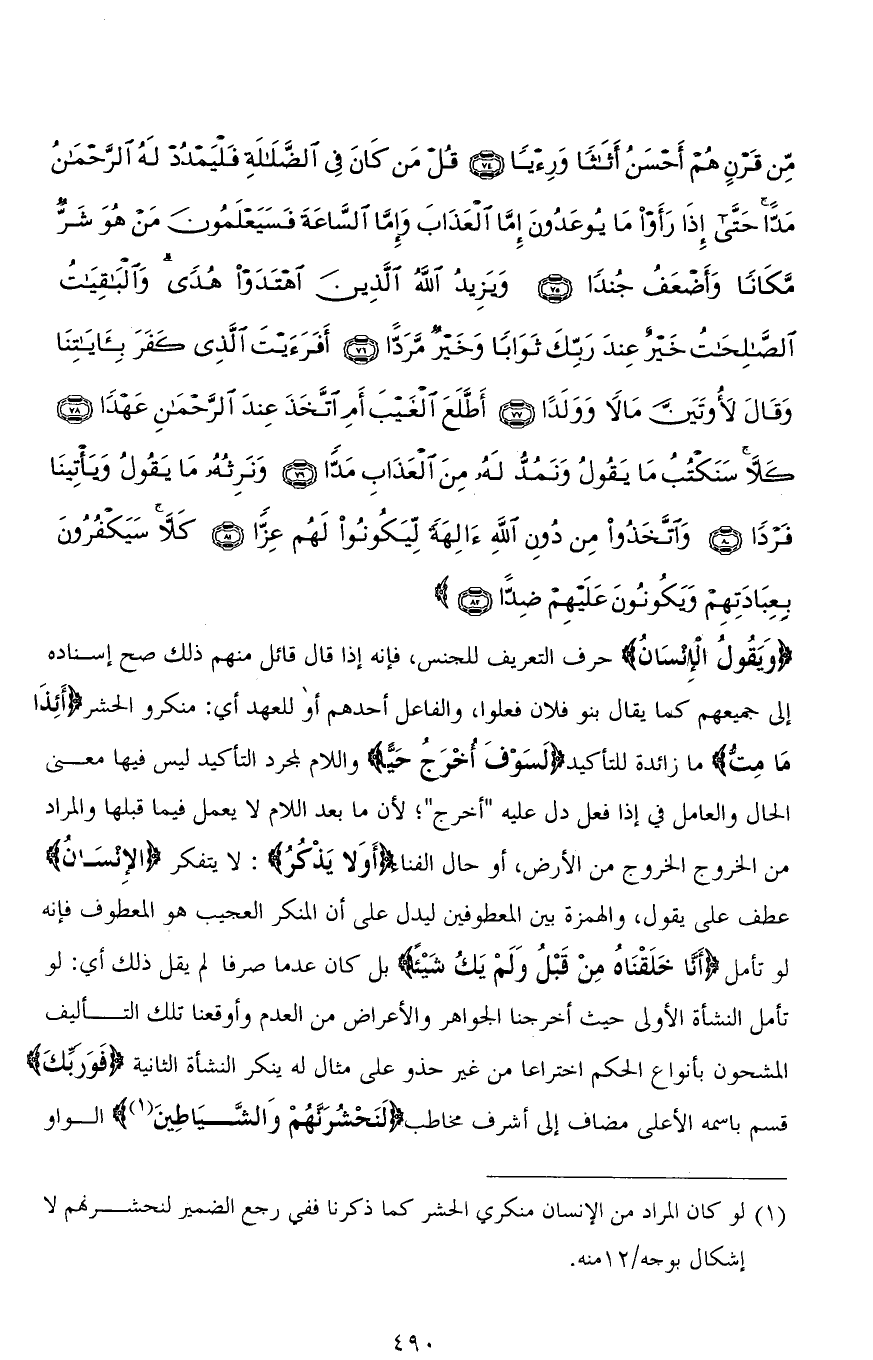 مِنْ قَرْنٍ هُمْ أَحْسَنُ أَثَاثًا وَرِئْيًا (74) قُلْ مَنْ كَانَ فِي الضَّلَالَةِ فَلْيَمْدُدْ لَهُ الرَّحْمَنُ مَدًّا حَتَّى إِذَا رَأَوْا مَا يُوعَدُونَ إِمَّا الْعَذَابَ وَإِمَّا السَّاعَةَ فَسَيَعْلَمُونَ مَنْ هُوَ شَرٌّ مَكَانًا وَأَضْعَفُ جُنْدًا (75) وَيَزِيدُ اللهُ الَّذِينَ اهْتَدَوْا هُدًى وَالْبَاقِيَاتُ الصَّالِحَاتُ خَيْرٌ عِنْدَ رَبِّكَ ثَوَابًا وَخَيْرٌ مَرَدًّا (76) أَفَرَأَيْتَ الَّذِي كَفَرَ بِآيَاتِنَا وَقَالَ لَأُوتَيَنَّ مَالًا وَوَلَدًا (77) أَطَّلَعَ الْغَيْبَ أَمِ اتَّخَذَ عِنْدَ الرَّحْمَنِ عَهْدًا (78) كَلَّا سَنَكْتُبُ مَا يَقُولُ وَنَمُدُّ لَهُ مِنَ الْعَذَابِ مَدًّا (79) وَنَرِثُهُ مَا يَقُولُ وَيَأْتِينَا فَرْدًا (80) وَاتَّخَذُوا مِنْ دُونِ اللهِ آلِهَةً لِيَكُونُوا لَهُمْ عِزًّا (81) كَلَّا سَيَكْفُرُونَ بِعِبَادَتِهِمْ وَيَكُونُونَ عَلَيْهِمْ ضِدًّا (82)