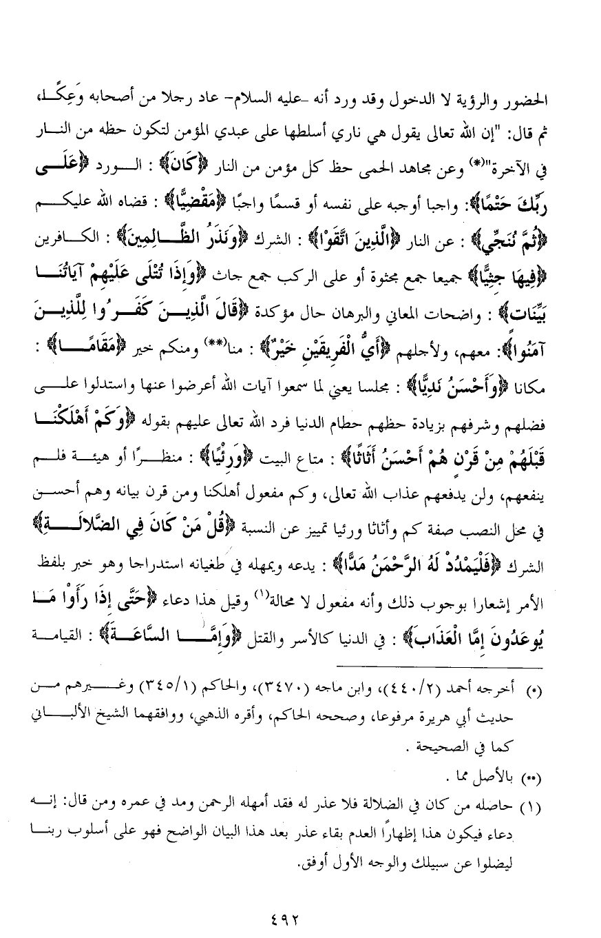 الحضور والرؤية لا الدخول وقد ورد أنه - عليه السلام - عاد رجلاً من أصحابه وَعِكًا، ثم قال: " إن الله تعالى يقول هي ناري أسلطها على عبدي المؤمن لتكون حظه من النار في الآخرة " وعن مجاهد الحمى حظ كل مؤمن من النار (كَانَ): الورد (عَلَى ربِّكَ حَتْمًا): واجبًا أوجبه على نفسه أو قسمًا واجبًا (مَقْضِيًّا): قضاه الله عليكم (ثُمَّ نُنَجِّي): عن النار (الَّذِينَ اتَّقَوْا): الشرك (وَنَذَرُ الظالِمِينَ): الكافرين (فِيهَا جثِيًّا) جميعًا جمع مجثوة أو على الركب جمع جاث (وَإِذَا تُتْلَى عَلَيْهِمْ آياتُنَا بَيِّنَات): واضحات المعاني والبرهان حال مؤكدة (قَالَ الَّذِينَ كَفَرُوا لِلَّذِينَ آمَنُوا): معهم، ولأجلهم (أَيُّ الْفَرِيقَيْنِ خَيْرٌ): منا ومنكم خير (مَقَامًا): مكانًا (وَأَحْسَنُ ندِيًّا): مجلسًا يعني لما سمعوا آيات الله أعرضوا عنها واستدلوا على فضلهم وشرفهم بزيادة حظهم حطام الدنيا فرد الله تعالى عليهم بقوله (وَكَمْ أَهْلَكْنَا قَبْلَهُمْ مِنْ قَرْنٍ هُمْ أَحْسَنُ أَثَاثًا): متاع البيت (وَرِئْيًا): منظرًا أو هيئة فلم ينفعهم، ولن يدفع عنهم عذاب الله تعالى، وكم مفعول أهلكنا ومن قرن بيانه وهم أحسن في محل النصب صفة كم وأثاثًا ورئيًا تمييز عن النسبة (قُلْ مَنْ كَانَ فِي الضَّلالَةِ) الشرك (فَلْيَمْدُدْ له الرَّحْمَنُ مَدًّا): يدعه ويمهله في طغيانه استدراجًا وهو خبر بلفظ الأمر إشعارًا بوجوب ذلك وأنه مفعول لا محالة وقيل هذا دعاء (حَتَّى إِذَا رَأَوْا ما يُوعَدُونَ إِمَّا الْعَذَابَ): في الدنيا كالأسر والقتل (وَإِمَّا السَّاعَةَ): القيامة