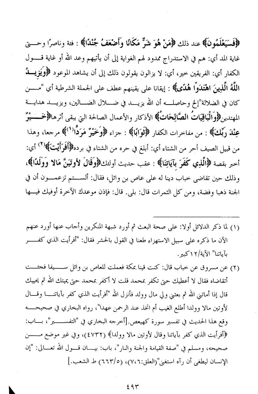 (فَسَيَعْلَمُونَ) عند ذلك (مَنْ هُوَ شَرٌّ مَكَانًا وَأَضْعَفُ جُنْدًا): فئة وناصرًا وحتى غاية المد أي: هم في الاستدراج ممدود لهم الغواية إلى أن يأتيهم وعد الله أو غاية قول الكفار أي: الفريقين خير، أي: لا يزالون يقولون ذلك إلى أن يشاهد الموعود (وَيَزِيدُ اللهُ الذِينَ اهْتَدَوْا هُدًى): إيقانًا على يقينهم عطف على الجملة الشرطية أي " من كان في الضلالة " إلخ وحاصله أن الله يزيد في ضلال الضالين، ويزيد هداية المهتدين (وَالْبَاقِيَاتُ الصَّالِحَاتُ) الأذكار والأعمال الصالحة التي يبقى أثرها (خيْرٌ عِنْدَ ربِّكَ): من مفاخرات الكفار (ثَوَابًا): جزاء (وَخَيْرٌ مَرَدًّا) مرجعًا، وهذا من قبيل الصيف أحرُّ من الشتاء أي: أبلغ في حره من الشتاء في برده (أَفَرَأَيْتَ) أي: أخبر بقصة (الَّذِي كَفَرَ بِآيَاتِنَا): عقب حديث أولئك (وَقَالَ لَأُوتَيَنَّ مَالًا وَوَلَدًا)، وذلك حين تقاضى خباب دَينًا له على العاص بن وائل، فقال: ألستم تزعمون أن في الجنة ذهبًا وفضة، ومن كل الثمرات قال: بلى. قال: فإذن موعدك الآخرة أو فيك فيها