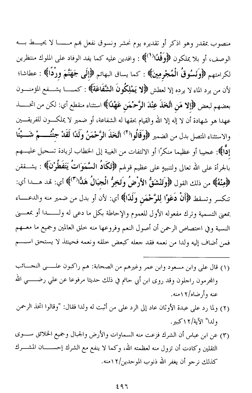 منصوب بمقدر وهو اذكر أو تقديره يوم نحشر ونسوق نفعل بهم ما لا يحيط به الوصف، أو بلا يملكون (وَفْدًا): وافدين عليه كما يفد الوفاد على الملوك منتظرين لكرامتهم (وَنَسُوقُ الْمُجْرِمِينَ): كما يساق البهائم (إِلَى جَهًّمَ وِرْدًا): عطاشا؛ لأن من يرد الماء لا يرده إلا لعطش (لا يَمْلِكُونَ الشَّفَاعَةَ): كما يشفع المؤمنون بعضهم لبعض (إِلَّا مَنِ اتَّخَذَ عِنْدَ الرَّحْمَنِ عَهْدً) استثناء منقطع أي: لكن من اتخذ عهدًا هو شهادة أن لا إله إلا الله والقيام بحقها له الشفاعة، أو ضمير لا يملكون للفريقين والاستثناء المتصل بدل من الضمير (وَقَالُوا اتَّخَذَ الرَّحْمَنُ وَلَدًا لَقَدْ جِئْتُمْ شَيْئًا إِدًّا): عجيبًا أو عظيمًا منكرًا أو الالتفات من الغيبة إلى الخطاب لزيادة [التسجيل] عليهم بالجرأة على الله تعالى [وللتنبيه] على عظيم قولهم (تَكَادُ السَّمَاوَاتُ يَتَفَطرْنَ): يشققن (مِنْهُ) من ذلك القول (وَتَنْشَقُّ الأرْضُ وَتَخِرُّ الْجِبَالُ هَدًّا) أي: تهدُّ هَدًّا أي: تنكسر وتسقط (أَن دَعَوْا لِلرَّحْمَنِ وَلَدًا) أي: لأن أو بدل من ضمير منه والدعاء بمعنى التسمية وترك مفعوله الأول للعموم والإحاطة بكل ما دعى له ولدًا أو بمعنى النسبة وفي اختصاص الرحمن أن أصول النعم وفروعها منه خلق العالمين وجميع ما معهم فمن أضاف إليه ولدا من نعمه فقد جعله كبعض خلقه ونعمه فحينئذ لا يستحق اسم