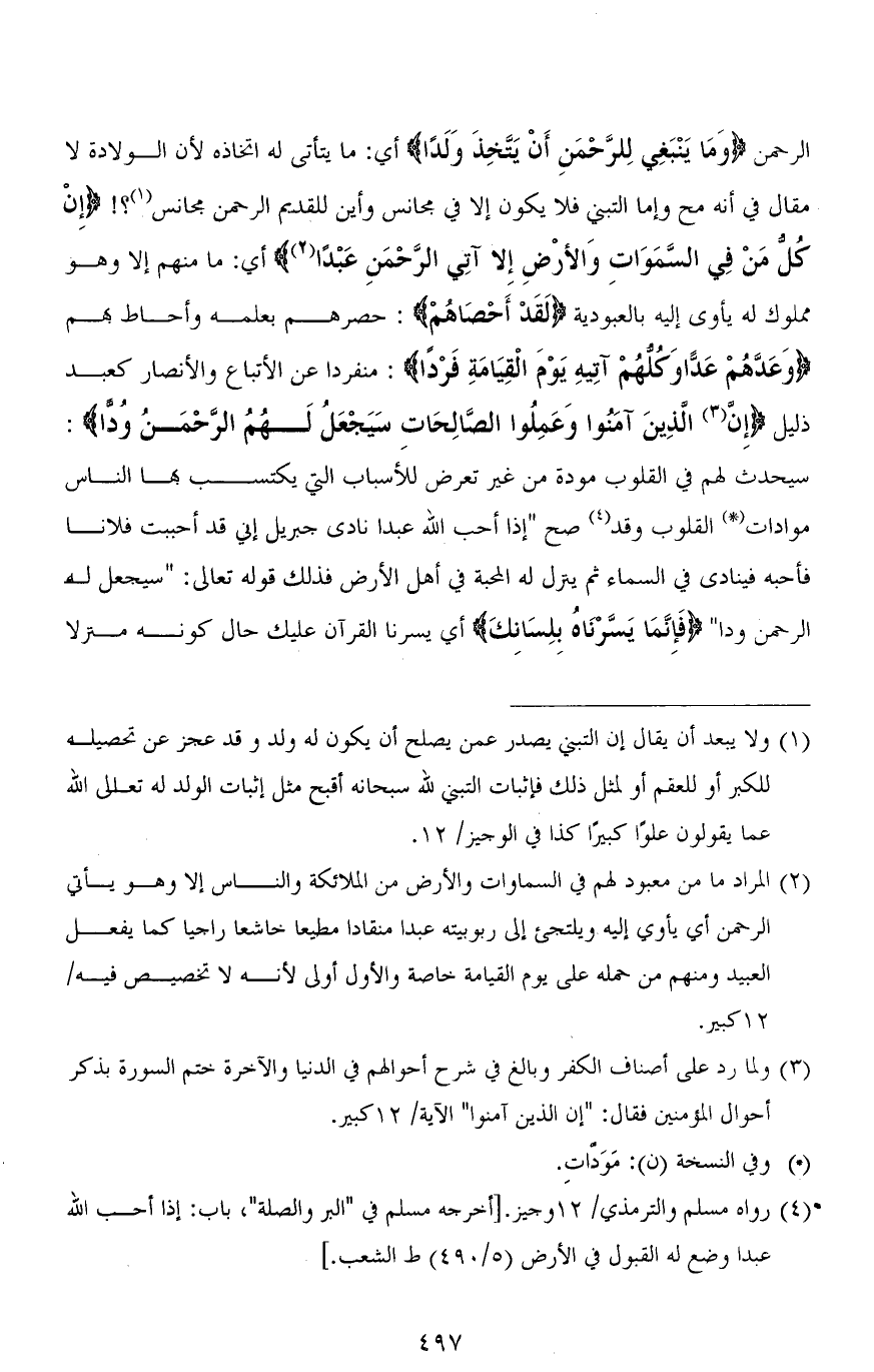الرحمن (وَمَا يَنْبَغِي لِلرَّحْمَنِ أَنْ يَتَّخِذَ وَلَدًا) أي: ما يتأتى له اتخاذه لأن الولادة لا مقال في [استحالتها] (1) وأما التبني فلا يكون إلا في مجانس وأين للقديم الرحمن مجانس؟! (إِنْ كُلُّ مَنْ فِي السَّمَاوَاتِ وَالْأَرْضِ إِلَّا آتِي الرَّحْمَنِ عَبْدًا) أي: ما منهم إلا وهو مملوك له يأوى إليه بالعبودية (لَقَدْ أَحْصَاهمْ): حصرهم بعلمه وأحاط بهم (وَعَدَّهُمْ عَدًّا وَكُلُّهُمْ آتِيهِ يَوْمَ الْقِيَامَةِ فَرْدًا): منفردًا عن الأتباع والأنصار كعبد ذليل (إِنَّ الَّذِينَ آمَنُوا وَعَمِلُوا الصَّالِحَاتِ سَيَجْعَلُ لَهُمُ الرَّحْمَنُ وُدًّا): سيحدث لهم في القلوب مودة من غير تعرض للأسباب التي يكتسب بها الناس موادات القلوب وقد صح " إذا أحب الله عبدًا نادى جبريل إني قد أحببت فلانًا فأحبه فينادى في السماء ثم ينزل له المحبة في أهل الأرض فذلك قوله تعالى. (سَيَجْعَلُ لَهُمُ الرَّحْمَنُ وُدًّا) (فَإِنَّمَا يَسَّرْنَاهُ بِلِسَانِكَ) أي يسرنا القرآن عليك حال كونه منزلاً