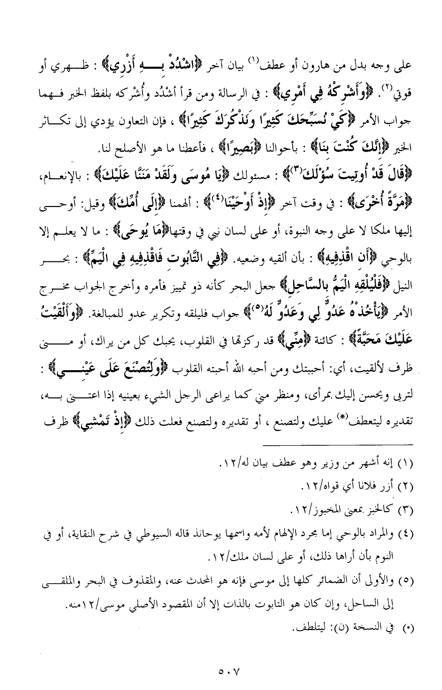 (قَالَ قَدْ أُوتِيتَ سُؤْلَكَ): مسئولك (يَا مُوسَى وَلَقَدْ مَنَنَّا عَلَيْكَ): بالإنعام، (مَرَّةً أُخْرَى): في وقت آخر (إِذ أَوْحَيْنَا): ألهمنا (إِلَى أُمِّكَ) وقيل: أوحى إليها ملكًا لا على وجه النبوة، أو على لسان نبي في وقتها (مَا يُوحَى): ما لا يعلم إلا بالوحي (أَنِ اقْذِفِيهِ): بأن ألقيه وضعيه. (فِي التَّابُوتِ فَاقْذِفِيهِ فِي الْيَمِّ): بحر النيل (فَلْيُلْقِهِ الْيَمُّ بِالسَّاحِلِ) جعل البحر كأنه ذو تمييز فأمره وأخرج الجواب مخرج الأمر (يَأْخُذْهُ عَدُوٌّ لِي وَعَدُوٌّ لَهُ) جواب فَلْيُلْقِهِ وتكرير عدو للمبالغة. (وَأَلْقَيْتُ عَلَيْكَ مَحَبَّةً): كائنة (مِنِّي) قد ركزتها في القلوب، يحبك كل من يراك، أو مني ظرف لـ ألقيت، أي: أحببتك ومن أحبه الله أحبته القلوب (وَلِتُصْنَعَ عَلَى عَيْنِي): لتربى ويحسن إليك بمرأى، ومنظر مني كما يراعى الرجل الشيء بعينيه إذا اعتني به، تقديره ليتعطف عليك ولتصنع، أو تقديره ولتصنع فعلت ذلك (إِذ تَمْشِي) ظرف