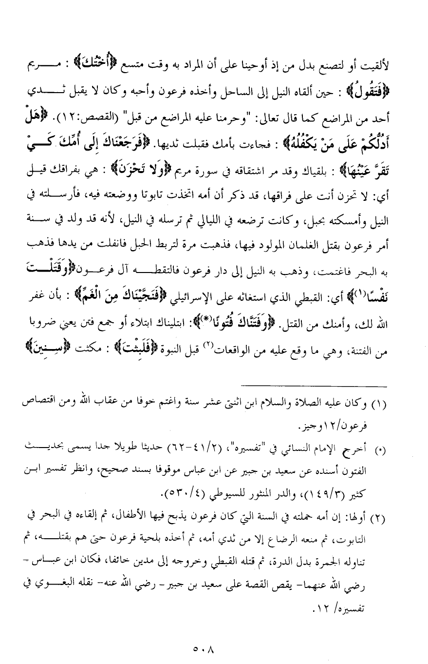 لـ ألقيت أو لتصنع بدل من إذ أوحينا على أن المراد به وقت متسع (أختكَ): مريم (فتَقُولُ): حين ألقاه النيل إلى الساحل وأخذه فرعون وأحبه وكان لا يقبل ثدي أحد من المراضع كما قال تعالى: (وَحَرَّمْنَا عَلَيْهِ الْمَرَاضِعَ مِنْ قَبْلُ) [القصص: 12]. (هَلْ أَدُلُّكُمْ عَلَى مَنْ يَكْفُلُهُ): فجاءت بأمك فقبلت ثديها. (فَرَجَعْنَاكَ إِلَى أُمِّكَ كَيْ تَقَرَّ عَيْنُهَا): بلقياك وقد مر اشتقاقه في سورة مريم (وَلا تَحْزَنَ): هي لفراقك قيل أي: لا تحزن أنت على فراقها، قد ذكر أن أمه اتخذت تابوتًا ووضعته فيه، فأرسلته في النيل وأمسكته بحبل، وكانت ترضعه في الليالي ثم ترسله في النيل، لأنه قد ولد في سنة أمر فرعون بقتل الغلمان المولود فيها، فذهبت مرة لتربط الحبل فانفلت من يدها فذهب به البحر فاغتمت، وذهب به النيل إلى دار فرعون فالتقطه آل فرعون (وَقَتَلْتَ نَفْسًا) أي: القبطي الذي استغاثه على الإسرائيلي (فَنَجَّيناكَ مِنَ الْغَمِّ): بأن غفر الله لك، وأمنك من القتل. (وَفَتَنَّاكَ فُتُونًا): ابتليناك ابتلاء أو جمع فتن يعني ضروبًا من الفتنة، وهي ما وقع عليه من الواقعات قبل النبوة (فَلَبِثْتَ): مكثت (سِنِينَ)
