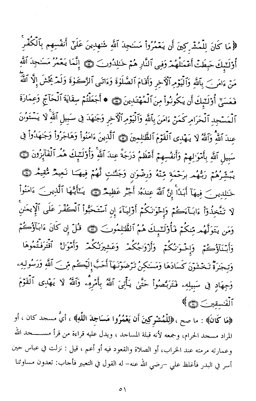 (مَا كَانَ لِلْمُشْرِكِينَ أَنْ يَعْمُرُوا مَسَاجِدَ اللهِ شَاهِدِينَ عَلَى أَنْفُسِهِمْ بِالْكُفْرِ أُولَئِكَ حَبِطَتْ أَعْمَالُهُمْ وَفِي النَّارِ هُمْ خَالِدُونَ (17) إِنَّمَا يَعْمُرُ مَسَاجِدَ اللهِ مَنْ آمَنَ بِاللهِ وَالْيَوْمِ الْآخِرِ وَأَقَامَ الصَّلَاةَ وَآتَى الزَّكَاةَ وَلَمْ يَخْشَ إِلَّا اللهَ فَعَسَى أُولَئِكَ أَنْ يَكُونُوا مِنَ الْمُهْتَدِينَ (18) أَجَعَلْتُمْ سِقَايَةَ الْحَاجِّ وَعِمَارَةَ الْمَسْجِدِ الْحَرَامِ كَمَنْ آمَنَ بِاللهِ وَالْيَوْمِ الْآخِرِ وَجَاهَدَ فِي سَبِيلِ اللهِ لَا يَسْتَوُونَ عِنْدَ اللهِ وَاللهُ لَا يَهْدِي الْقَوْمَ الظَّالِمِينَ (19) الَّذِينَ آمَنُوا وَهَاجَرُوا وَجَاهَدُوا فِي سَبِيلِ اللهِ بِأَمْوَالِهِمْ وَأَنْفُسِهِمْ أَعْظَمُ دَرَجَةً عِنْدَ اللهِ وَأُولَئِكَ هُمُ الْفَائِزُونَ (20) يُبَشِّرُهُمْ رَبُّهُمْ بِرَحْمَةٍ مِنْهُ وَرِضْوَانٍ وَجَنَّاتٍ لَهُمْ فِيهَا نَعِيمٌ مُقِيمٌ (21) خَالِدِينَ فِيهَا أَبَدًا إِنَّ اللهَ عِنْدَهُ أَجْرٌ عَظِيمٌ (22) يَا أَيُّهَا الَّذِينَ آمَنُوا لَا تَتَّخِذُوا آبَاءَكُمْ وَإِخْوَانَكُمْ أَوْلِيَاءَ إِنِ اسْتَحَبُّوا الْكُفْرَ عَلَى الْإِيمَانِ وَمَنْ يَتَوَلَّهُمْ مِنْكُمْ فَأُولَئِكَ هُمُ الظَّالِمُونَ (23) قُلْ إِنْ كَانَ آبَاؤُكُمْ وَأَبْنَاؤُكُمْ وَإِخْوَانُكُمْ وَأَزْوَاجُكُمْ وَعَشِيرَتُكُمْ وَأَمْوَالٌ اقْتَرَفْتُمُوهَا وَتِجَارَةٌ تَخْشَوْنَ كَسَادَهَا وَمَسَاكِنُ تَرْضَوْنَهَا أَحَبَّ إِلَيْكُمْ مِنَ اللهِ وَرَسُولِهِ وَجِهَادٍ فِي سَبِيلِهِ فَتَرَبَّصُوا حَتَّى يَأْتِيَ اللهُ بِأَمْرِهِ وَاللهُ لَا يَهْدِي الْقَوْمَ الْفَاسِقِينَ (24)