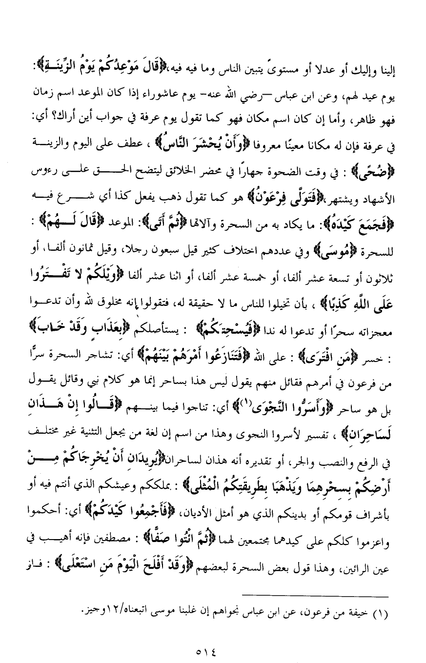 إلينا وإليك أو عدلاً أو مستوىً يتبين الناس وما فيه فيه، (قَالَ مَوْعِدُكُمْ يَوْمُ الزِّينَةِ): يوم عيد لهم، وعن ابن عباس - رضي الله عنه - يوم عاشوراء إذا كان الموعد اسم زمان فهو ظاهر، وأما إن كان اسم مكان فهو كما تقول يوم عرفة في جواب أين أراك؟ أي: في عرفة فإن له مكانًا معينًا معروفًا (وَأَن يُحْشَرَ النَّاسُ)، عطف على اليوم والزينة (ضُحًى): في وقت الضحوة جهارًا في محضر الخلائق ليتضح الحق على رءوس الأشهاد ويشتهر، (فَتَوَلَّى فِرْعَوْنُ) هو كما تقول ذهب يفعل كذا أي شرع فيه (فَجَمَعَ كَيْدَهُ): ما يكاد به من السحرة وآلاتها (ثُمَّ أَتَى): الموعد (قَالَ لَهُمْ): للسحرة (مُوسَى) وفي عددهم اختلاف كثير قيل سبعون رجلاً، وقيل ثمانون ألفًا أو ثلاثون أو تسعة عشر ألفًا، أو خمسة عشر ألفًا، أو اثنا عشر ألفًا (وَيْلَكُمْ لا تَفتَرُوا عَلَى اللهِ كَذِبًا)، بأن تخيلوا للناس ما لا حقيقة له، فتقولوا إنه مخلوق لله وأن تدعوا معجزاته سحرًا أو تدعوا له ندا (فَيُسْحِتَكُمْ): يستأصلكم (بِعَذَابٍ وَقَدْ خَابَ): خسر (مَنِ افْتَرَى): على الله (فَتَنَازَعُوا أَمْرَهُمْ بَيْنَهُمْ) أي: تشاجر السحرة سرًّا من فرعون في أمرهم فقائل منهم يقول ليس هذا بساحر إنما هو كلام نبي وقائل يقول بل هو ساحر (وَأَسَرُّوا النَّجْوَى) أي: تناجوا فيما بينهم (قَالُوا إِنْ هَذَانِ لَسَاحِرَانِ)، تفسير لـ أَسَرُّوا النَّجْوَى وهذا من اسم إن لغة من يجعل التثنية غير مختلف في الرفع والنصب والجر، أو تقديره أنه هذان لساحران (1) (يُرِيدَانِ أَنْ يُخْرِجَاكُمْ مِن أَرْضِكُمْ بِسِحْرِهِمَا وَيَذْهَبَا بِطَرِيقَتكُم الْمُثْلَى): بملككم وعيشكم الذي أنتم فيه أو بأشراف قومكم أو بدينكم الذي هو أمثل الأديان، (فأَجْمِعوا كَيْدَكُمْ) أي: أحكموا واعزموا كلكم على كيدهما مجتمعين لهما (ثُمَّ ائْتُوا صَفًّا): مصطفين فإنه أهيب في عين الرائين، وهذا قول بعض السحرة لبعضهم (وَقَدْ أَفْلَحَ الْيَوْمَ مَنِ اسْتَعْلَى): فإن