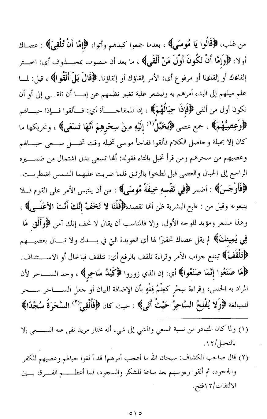 من غلب، (قَالُوا يَا مُوسَى)، بعدما جمعوا كيدهم وأتوا، (إِمَّا أَن تُلْقِيَ): عصاك أولاً، (وَإِمَّا أَنْ نَكُونَ أَوَّلَ مَنْ أَلْقَى)، ما بعد أن منصوب بمحذوف أي: اختر إلقاءك أو إلقاءنا أو مرفوع أي: الأمر إلقاؤك أو إلقاؤنا. (قَالَ بَلْ أَلْقُوا)، قيل: لما علم ميلهم إلى البدء أمرهم به وليشعر علية تغيير نظمهم عن إما أن تلقي إلى أو أن نكون أول من ألقى (فَإِذَا حِبَالُهُمْ)، إذا للمفاجأة أي: فألقوا فإذا حبالهم (وَعِصِيُّهُمْ)، جمع عصى (يُخَيَّلُ إِلَيْهِ مِنْ سِحْرِهِمْ أَنَّهَا تَسْعَى)، وتحريكها ما كان إلا بحيلة وحاصل الكلام فألقوا ففاجأ موسى تخيله وقت تخيل سعى حبالهم وعصيهم من سحرهم ومن قرأ تخيل بالتاء فقوله: أنها تسعى بدل اشتمال من ضميره الراجع إلى الحبال والعصي قيل لطخوا بالزئبق فلما ضربت عليهما الشمس اضطربت. (فَأَوْجَسَ): أضمر (فِي نَفْسِهِ خِيفَةً مُوسَى): من أن يلتبس الأمر على القوم فلا يتبعونه وقيل من: طبع البشرية ظن أنها تقصده (قُلْنَا لَا تَخَفْ إِنَّكَ أَنْتَ الْأَعْلَى)، وهذا مشعر ومؤيد للوجه الأول، وإلا فالمناسب أن يقال لا تخف إنك آمن (وَأَلْقِ ما فِي يَمِينِكَ) لم يقل عصاك تحقيرًا لها أي العويدة التي في يدك ولا تبال بعصيهم (تَلْقَفْ) تبتلع جواب الأمر وقراءة تلقف بالرفع أي: تتلقف فبالحال أو الاستئناف. (ما صَنَعُوا إِنَّمَا صَنَعُوا) أي: إن الذي زوروا (كَيْدُ سَاحِرٍ)، وحد الساحر لأن المراد به الجنس، وقراءة سِحْرٍ كعِلْمُ فِقْهٍ بأن الإضافة للبيان أو جعل الساحر سحر للمبالغة (وَلَا يُفْلِحُ السَّاحِرُ حَيثُ أَتَى): حيث كان (فأُلْقِيَ السَّحَرَةُ سُجَّدًا)
