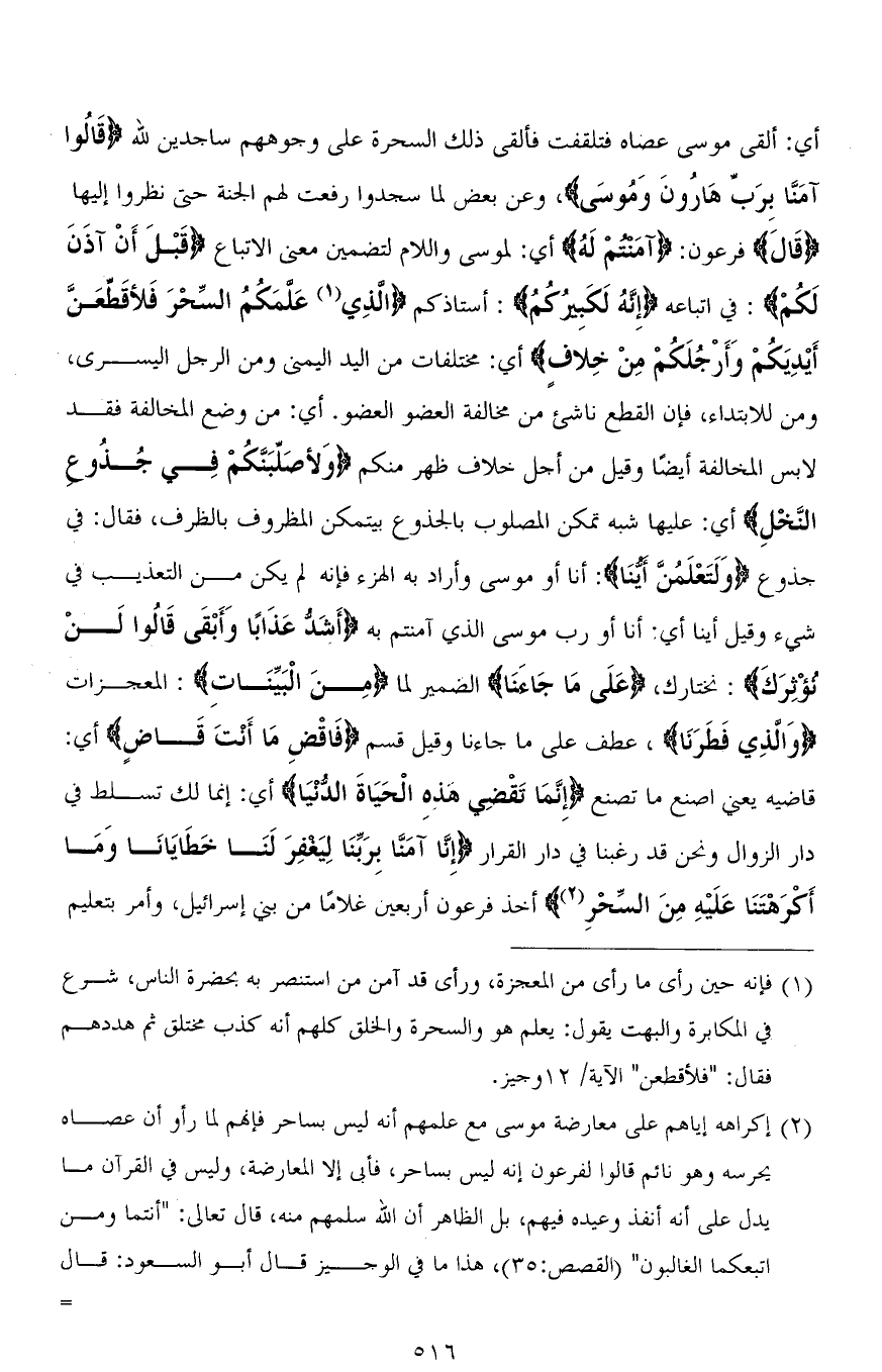 أي: ألقى موسى عصاه فتلقفت فألقى ذلك السحرة على وجوههم ساجدين لله (قَالُوا آمَنَّا بِرَبِّ هَارُونَ وَموسَى)، وعن بعض لما سجدوا رفعت لهم الجنة حتى نظروا إليها (قَالَ) فرعون: (آمَنتمْ به) أي: لموسى واللام لتضمين معنى الاتباع (قَبْلَ أَنْ آذَنَ لَكمْ): في اتباعه (إِنَّهُ لَكَبِيرُكُمُ): أستاذكم (الَّذِي عَلَّمَكُمُ السِّحْرَ فَلَأُقَطِّعَنَّ أَيْدِيَكُمْ وَأَرْجُلَكُمْ مِنْ خِلَافٍ) أي: مختلفات من اليد اليمني ومن الرجل اليسرى، ومن للابتداء، فإن القطع ناشئ من مخالفة العضو العضو. أي: من وضع المخالفة فقد لابس المخالفة أيضًا وقيل من أجل خلاف ظهر منكم (وَلَأُصَلِّبَنَّكُمْ فِي جُذُوعِ النَّخْلِ) أي: عليها شبه تمكن المصلوب بالجذوع [بتمكن] المظروف بالظرف، فقال: في جذوع (وَلَتَعْلَمُنَّ أَيُّنَا): أنا أو موسى وأراد به الهزء فإنه لم يكن من التعذيب في شيء وقيل أينا أي؛ أنا أو رب موسى الذي آمنتم به (أَشَدُّ عَذابًا وَأَبْقَى قَالُوا لَن نُؤْثِرَكَ): نختارك، (عَلَى مَا جَاءَنَا) الضمير لما (مِنَ الْبَيِّنَاتِ): المعجزات (وَالَّذِي فَطَرَنَا)، عطف على ما جاءنا وقيل قسم (فَاقْضِ مَا أَنْتَ قَاضٍ) أي: قاضيه يعني اصنع ما تصنع (إِنَّمَا تَقْضِي هَذِهِ الْحَيَاةَ الدُّنْيَ) أي: إنما لك تسلط في دار الزوال ونحن قد رغبنا في دار القرار (إِنَّا آمَنَّا بِرَبِّنَا لِيَغْفِرَ لَنَا خَطَايَانَا وَمَا أَكْرَهْتَنَا عَلَيْهِ مِنَ السِّحْرِ) أخذ فرعون أربعين غلامًا من بني إسرائيل، وأمر بتعليم