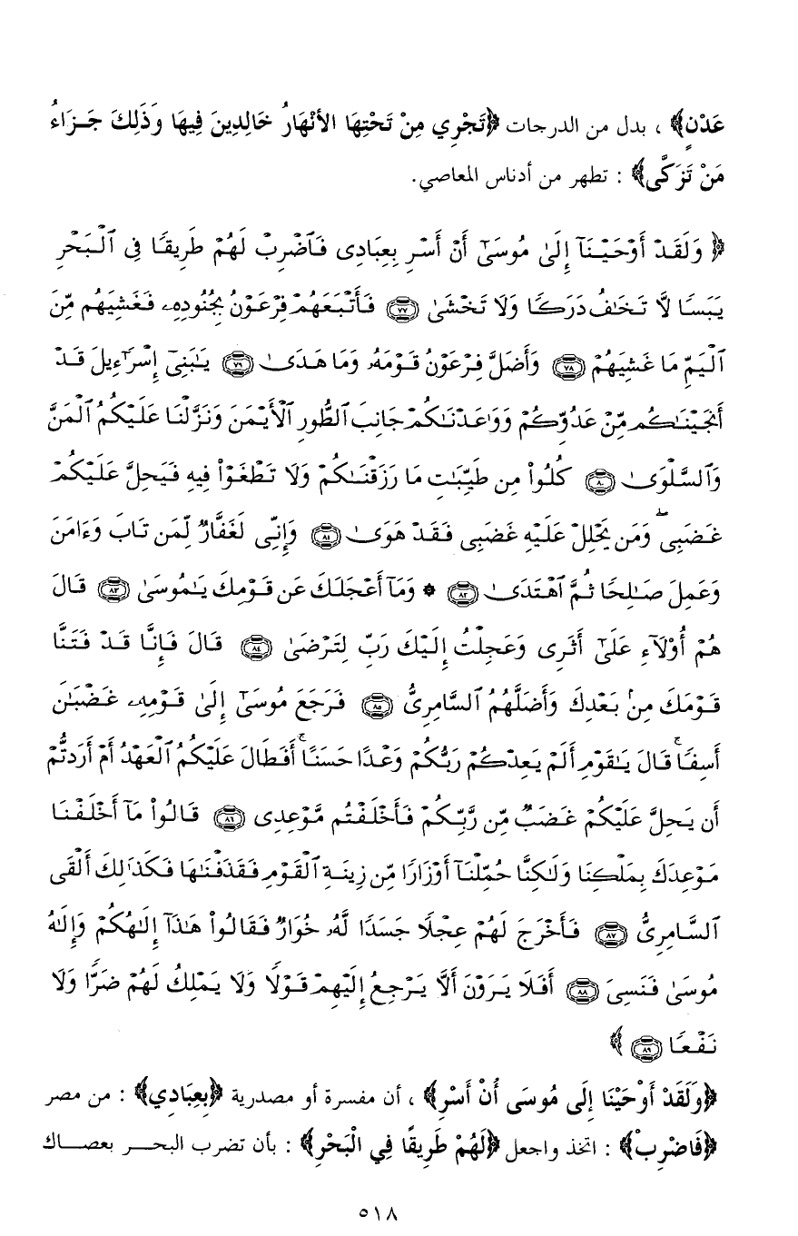 (وَلَقَدْ أَوْحَيْنَا إِلَى مُوسَى أَنْ أَسْرِ بِعِبَادِي فَاضْرِبْ لَهُمْ طَرِيقًا فِي الْبَحْرِ يَبَسًا لَا تَخَافُ دَرَكًا وَلَا تَخْشَى (77) فَأَتْبَعَهُمْ فِرْعَوْنُ بِجُنُودِهِ فَغَشِيَهُمْ مِنَ الْيَمِّ مَا غَشِيَهُمْ (78) وَأَضَلَّ فِرْعَوْنُ قَوْمَهُ وَمَا هَدَى (79) يَا بَنِي إِسْرَائِيلَ قَدْ أَنْجَيْنَاكُمْ مِنْ عَدُوِّكُمْ وَوَاعَدْنَاكُمْ جَانِبَ الطُّورِ الْأَيْمَنَ وَنَزَّلْنَا عَلَيْكُمُ الْمَنَّ وَالسَّلْوَى (80) كُلُوا مِنْ طَيِّبَاتِ مَا رَزَقْنَاكُمْ وَلَا تَطْغَوْا فِيهِ فَيَحِلَّ عَلَيْكُمْ غَضَبِي وَمَنْ يَحْلِلْ عَلَيْهِ غَضَبِي فَقَدْ هَوَى (81) وَإِنِّي لَغَفَّارٌ لِمَنْ تَابَ وَآمَنَ وَعَمِلَ صَالِحًا ثُمَّ اهْتَدَى (82) وَمَا أَعْجَلَكَ عَنْ قَوْمِكَ يَا مُوسَى (83) قَالَ هُمْ أُولَاءِ عَلَى أَثَرِي وَعَجِلْتُ إِلَيْكَ رَبِّ لِتَرْضَى (84) قَالَ فَإِنَّا قَدْ فَتَنَّا قَوْمَكَ مِنْ بَعْدِكَ وَأَضَلَّهُمُ السَّامِرِيُّ (85) فَرَجَعَ مُوسَى إِلَى قَوْمِهِ غَضْبَانَ أَسِفًا قَالَ يَا قَوْمِ أَلَمْ يَعِدْكُمْ رَبُّكُمْ وَعْدًا حَسَنًا أَفَطَالَ عَلَيْكُمُ الْعَهْدُ أَمْ أَرَدْتُمْ أَنْ يَحِلَّ عَلَيْكُمْ غَضَبٌ مِنْ رَبِّكُمْ فَأَخْلَفْتُمْ مَوْعِدِي (86) قَالُوا مَا أَخْلَفْنَا مَوْعِدَكَ بِمَلْكِنَا وَلَكِنَّا حُمِّلْنَا أَوْزَارًا مِنْ زِينَةِ الْقَوْمِ فَقَذَفْنَاهَا فَكَذَلِكَ أَلْقَى السَّامِرِيُّ (87) فَأَخْرَجَ لَهُمْ عِجْلًا جَسَدًا لَهُ خُوَارٌ فَقَالُوا هَذَا إِلَهُكُمْ وَإِلَهُ مُوسَى فَنَسِيَ (88) أَفَلَا يَرَوْنَ أَلَّا يَرْجِعُ إِلَيْهِمْ قَوْلًا وَلَا يَمْلِكُ لَهُمْ ضَرًّا وَلَا نَفْعًا (89)