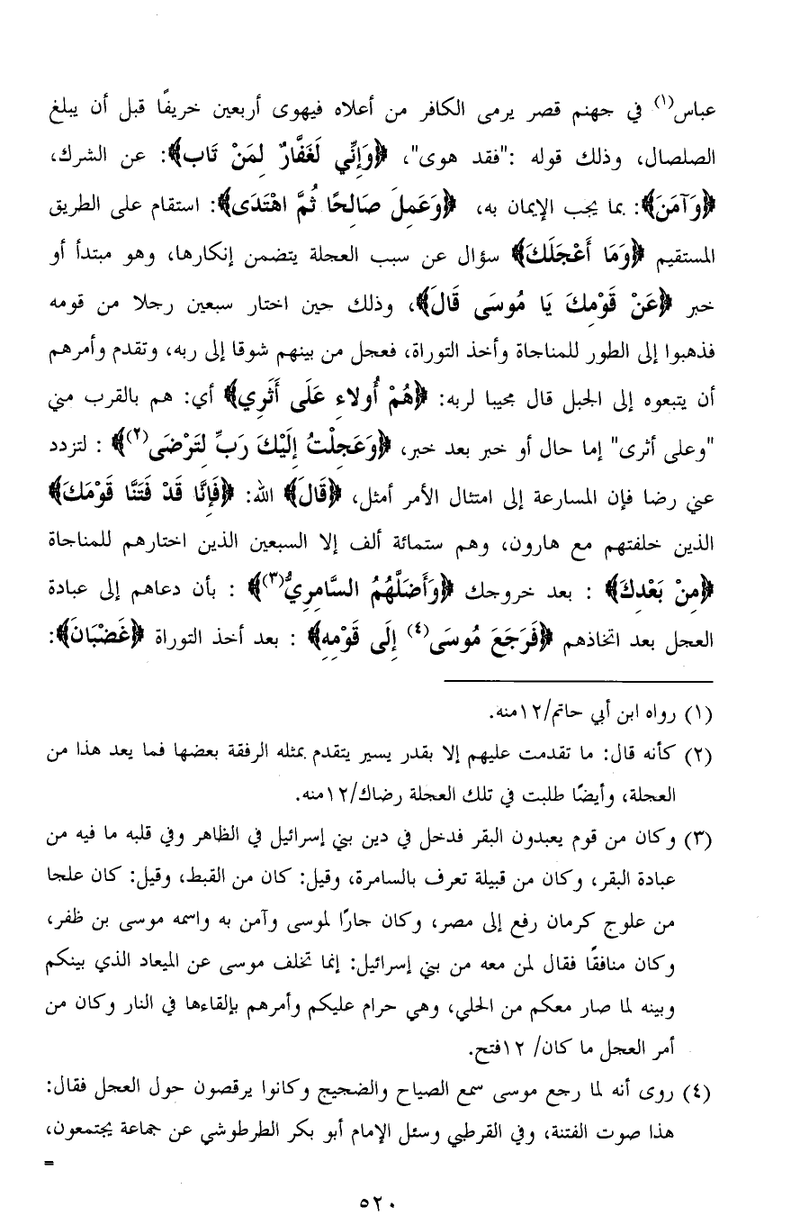 عباس في جهنم قصر يرمى الكافر من أعلاه فيهوى أربعين خريفًا قبل أن يبلغ الصلصال، وذلك قوله: (فَقَدْ هَوَى)، (وَإِنِّي لَغَفَّارٌ لِمَنْ تَابَ): عن الشرك، (وَآمَنَ): بما يجب الإيمان به، (وَعَمِلَ صَالِحًا ثُمً اهْتَدَى): استقام على الطريق المستقيم (وَمَا أَعْجَلَكَ) سؤال عن سبب العجلة يتضمن إنكارها، وهو مبتدأ أو خبر (عَنْ قَوْمِكَ يَا مُوسى قَالَ)، وذلك حين اختار سبعين رجلاً من قومه فذهبوا إلى الطور للمناجاة وأخذ التوراة، فعجل من بينهم شوقًا إلى ربه، وتقدم وأمرهم أن يتبعوه إلى الجبل قال مجيبًا لربه: (هُمْ أُولَاءِ عَلَى أَثَرِي) أي: هم بالقرب مني " وعلى أثرى " إما حال أو خبر بعد خبر، (وَعَجِلْتُ إِلَيْكَ رَبِّ لِتَرْضَى): لتزدد عني رضا فإن المسارعة إلى امتثال الأمر أمثل، (قَالَ) الله: (فَإِنَّا قَدْ فَتَنَّا قَوْمَكَ) الذين خلفتهم مع هارون، وهم ستمائة ألف إلا السبعين الذين اختارهم للمناجاة (مِنْ بَعْدِكَ): بعد خروجك (وَأَضَلَّهُمُ السَّامِرِيُّ): بأن دعاهم إلى عبادة العجل بعد اتخاذهم (فَرَجَعَ مُوسَى إِلَى قَوْمِهِ): بعد أخذ التوراة (غَضْبَانَ):
