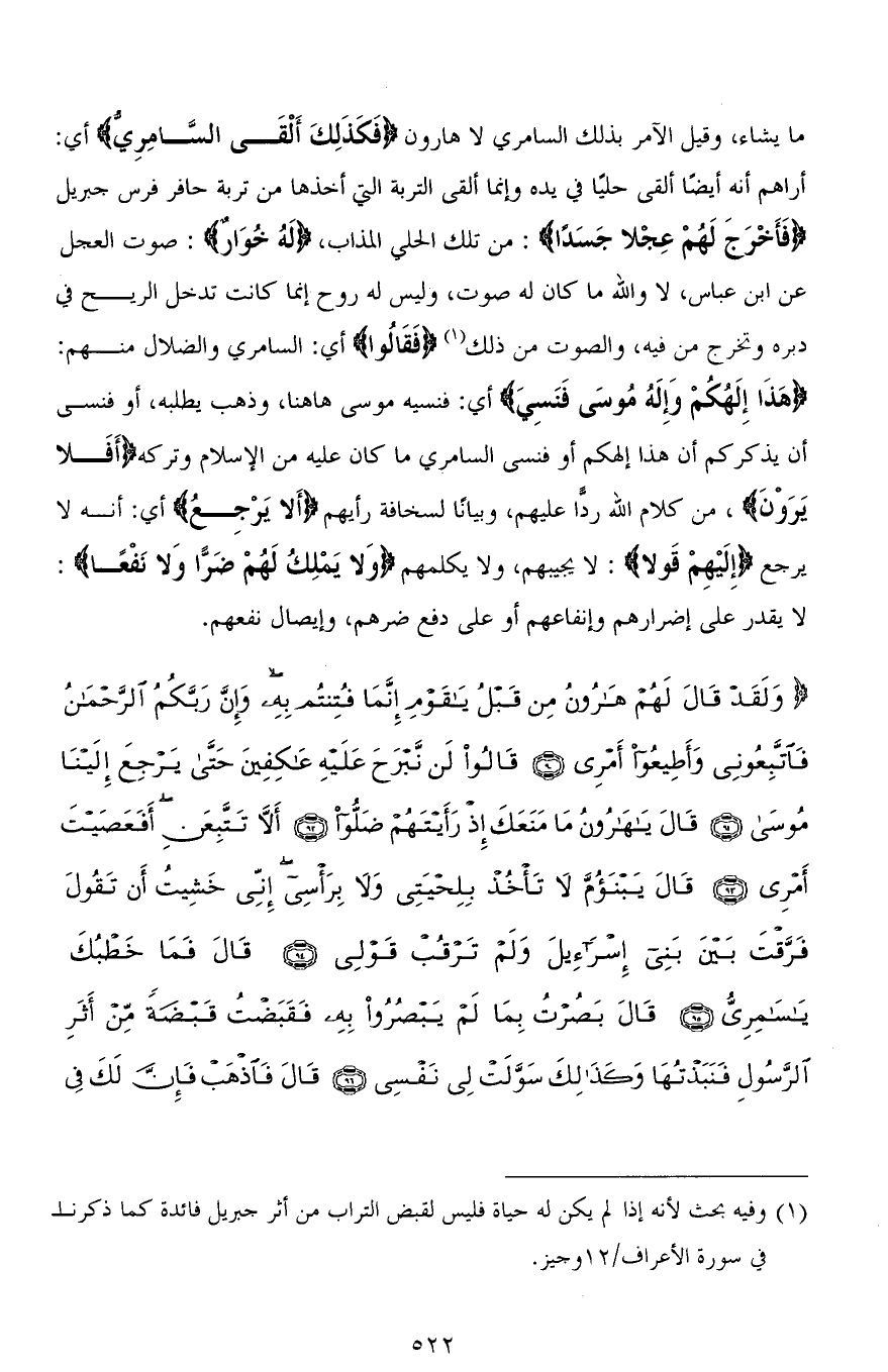 (وَلَقَدْ قَالَ لَهُمْ هَارُونُ مِنْ قَبْلُ يَا قَوْمِ إِنَّمَا فُتِنْتُمْ بِهِ وَإِنَّ رَبَّكُمُ الرَّحْمَنُ فَاتَّبِعُونِي وَأَطِيعُوا أَمْرِي (90) قَالُوا لَنْ نَبْرَحَ عَلَيْهِ عَاكِفِينَ حَتَّى يَرْجِعَ إِلَيْنَا مُوسَى (91) قَالَ يَا هَارُونُ مَا مَنَعَكَ إِذْ رَأَيْتَهُمْ ضَلُّوا (92) أَلَّا تَتَّبِعَنِ أَفَعَصَيْتَ أَمْرِي (93) قَالَ يَبْنَؤُمَّ لَا تَأْخُذْ بِلِحْيَتِي وَلَا بِرَأْسِي إِنِّي خَشِيتُ أَنْ تَقُولَ فَرَّقْتَ بَيْنَ بَنِي إِسْرَائِيلَ وَلَمْ تَرْقُبْ قَوْلِي (94) قَالَ فَمَا خَطْبُكَ يَا سَامِرِيُّ (95) قَالَ بَصُرْتُ بِمَا لَمْ يَبْصُرُوا بِهِ فَقَبَضْتُ قَبْضَةً مِنْ أَثَرِ الرَّسُولِ فَنَبَذْتُهَا وَكَذَلِكَ سَوَّلَتْ لِي نَفْسِي (96) قَالَ فَاذْهَبْ فَإِنَّ لَكَ فِي