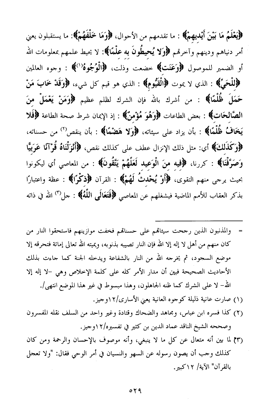 (يَعْلَمُ مَا بَيْنَ أَيْدِيهِمْ): ما تقدمهم من الأحوال، (وَمَا خَلْفَهُمْ): ما يستقبلون يعني أمر دنياهم ودينهم وآخرتهم (وَلَا يُحِيطُونَ بِهِ عِلْمًا): لا يحيط علمهم بمعلومات الله أو الضمير للموصول (وَعَنَتِ) خضعت وذلَّت، (الْوُجُوهُ): وجوه العالمين (لِلْحَيِّ): الذي لا يموت (الْقيومِ): الذي هو قيم كل شيء، (وَقَدْ خَابَ مَنْ حَمَلَ ظُلْمًا): من أشرك بالله فإن الشرك لظلم عظيم (وَمَنْ يَعْمَلْ مِنَ الصالِحاتِ): بعض الطاعات (وَهُوَ مُؤْمِنٌ): إذ الإيمان شرط صحة الطاعة (فَلا يَخَافُ ظُلْمًا): بأن يزاد على سيئاته، (وَلا هَضمًا): بأن ينقص من حسناته، (وَكَذَلِكَ) أي: مثل ذلك الإنزال عطف على كذلك نقص، (أَنزَلْنَاهُ قُرْآنًا عَرَبِيًّا وَصَرَّفْنَا): كررنا، (فِيه مِنَ الْوَعِيدِ لَعَلَّهُمْ يَتَّقُونَ): من المعاصي أي ليكونوا بحيث يرجى منهم التقوى، (أَوْ يُحْدِثُ لَهُم): القرآن (ذِكْرًا): عظة واعتبارًا بذكر العقاب للأمم الماضية فيشغلهم عن المعاصي (فَتَعَالَى اللهُ): جل الله في ذاته