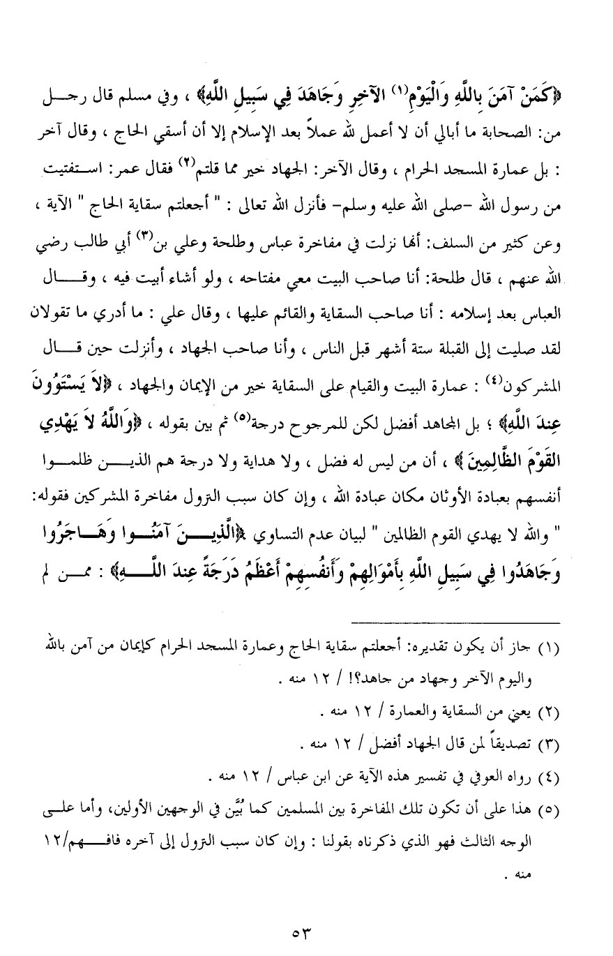 (كَمَنْ آمَنَ بِاللهِ وَالْيَوْمِ الْآخِرِ وَجَاهَدَ فِي سَبِيلِ اللهِ)، وفي مسلم قال رجل من: الصحابة ما أبالي أن لا أعمل لله عملاً بعد الإسلام إلا أن أسقى الحاج، وقال آخر: بل عمارة المسجد الحرام، وقال الآخر: الجهاد خير مما قلتم فقال عمر: استفتيت من رسول الله - صلى الله عليه وسلم - فأنزل الله تعالى: " أجعلتم سقاية الحاج " الآية، وعن كثير من السلف: أنها نزلت في مفاخرة العباس وطلحة وعلي بن أبي طالب رضي الله عنهم، قال طلحة: أنا صاحب البيت معي مفتاحه، ولو أشاء أبيت فيه، وقال العباس بعد إسلامه: أنا صاحب السقاية والقائم عليها، وقال علي: ما أدري ما تقولان لقد صليت إلى القبلة ستة أشهر قبل الناس، وأنا صاحب الجهاد، وأنزلت حين قال المشركون: عمارة البيت والقيام على السقاية خير من الإيمان والجهاد، (لاَ يَسْتَوُون عِندَ اللهِ)، بل المجاهد أفضل لكن للمرجوح درجة ثم بين بقوله، (وَاللهُ لاَ يَهْدَي القَوْمَ الظَّالِمِينَ)، أن من ليس له فضل، ولا هداية ولا درجة هم الذين ظلموا أنفسهم بعبادة الأوثان مكان عبادة الله، وإن كان سبب النزول مفاخرة المشركين فقوله: " والله لا يهدي القوم الظالمين " لبيان عدم التساوي (الَّذِينَ آمَنُوا وَهَاجَرُوا وَجَاهَدُوا فِي سَبِيلِ اللهِ بِأَمْوَالِهِمْ وَأَنْفُسِهِمْ أَعْظَمُ دَرَجَةً عِنْدَ اللهِ): ممن لم