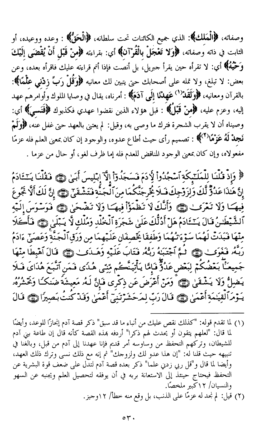 وصفاته، (الْمَلِكُ): الذي جميع الكائنات تحت سلطانه، (الْحَقُّ): وعده ووعيده، أو الثابت في ذاته وصفاته، (وَلا تَعْجَلْ بالْقُرْآنِ) أي: بقراءته (مِنْ قَبْلِ أَنْ يُقْضَى إِلَيْكَ وَحْيهُ) أي: لا تقرأه حين يقرأ جبريل، بل أنصت فإذا أتم قراءته عليك فاقرأه بعده، وعن بعض: لا تبلغ، ولا تمله على أصحابك حتى يتبين لك معانيه (وَقُلْ رَبِّ زِدْنِي عِلْمًا): بالقرآن ومعانيه، (وَلَقَدْ عَهدنَا إِلَى آدَمَ): أمرناه، يقال في وصايا الملوك وأوامرهم عهد إليه، وعزم عليه، (مِنْ قَبْلُ): قبل هؤلاء الذين نقضوا عهدى فكذبوك (فَنَسِيَ) أي: وصيناه أن لا يقرب الشجرة فترك ما وصى به، وقيل: لم يعتني بالعهد حتى غفل عنه، (وَلَمْ نَجِدْ لَهُ عَزْمً): تصميم رأى حيث أطاع عدوه، والوجود إن كان بمعنى العلم فله عزمًا مفعولاه، وإن كان بمعنى الوجود المناقض للعدم فله إما ظرف لغو، أو حال من عزمًا.