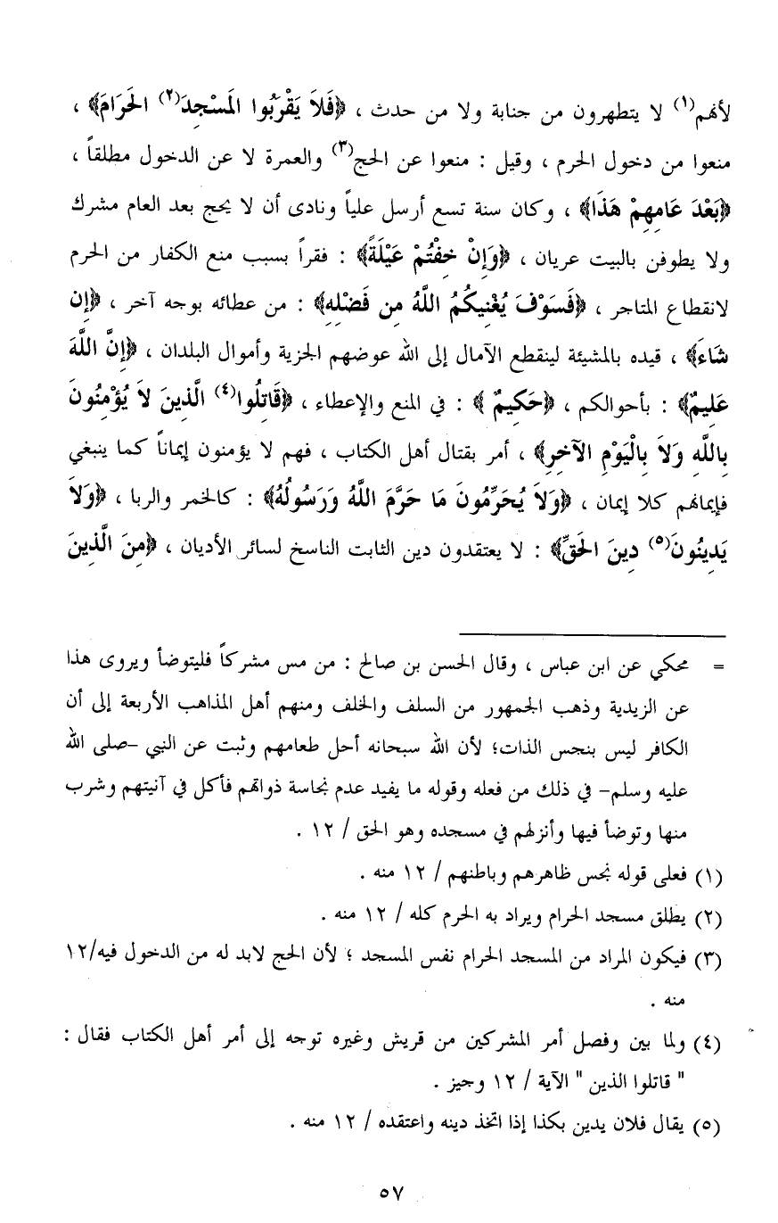 لأنَّهُم لا يتطهرون من جنابة ولا من حدث، (فَلاَ يَقْربوا المَسْجِدَ الحَرَامَ)، منعوا من دخول الحرم، وقيل: منعوا عن الحج والعمرة لا عن الدخول مطلقًا، (بَعْدَ عَامِهِمْ هَذا)، وكان سنة تسع أرسل علياً ونادى أن لا يحج بعد العام مشرك ولا يطوفن بالبيت عريان، (وَإِذ خِفتمْ عَيْلَةً): فقراً بسبب منع الكفار من الحرم لانقطاع المتاجر، (فَسَوْفَ يُغْنِيكُمُ اللهُ مِنْ فَضْلِهِ): من عطائه بوجه آخر، (إن شَاءَ)، قيده بالمشيئة لينقطع الآمال إلى الله عوضهم الجزية وأموال البلدان، (إِن الَلَّهَ عَلِيمٌ): بأحوالكم، (حَكِيمٌ): في المنع والإعطاء، (قَاتِلُوا الَّذِينَ لَا يُؤْمِنُونَ بِاللهِ وَلَا بِالْيَوْمِ الْآخِرِ)، أمر بقتال أهل الكتاب، فهم لا يؤمنون إيماناً كما ينبغي فإيمانهم كلا إيمان، (وَلَا يُحَرِّمُونَ مَا حَرَّمَ اللهُ وَرَسُولُهُ): كالخمر والربا، (وَلاَ يَدِينونَ دِينَ الحَقِّ): لا يعتقدون دين الثابت الناسخ لسائر، الأديان، (مِنَ الذِينَ