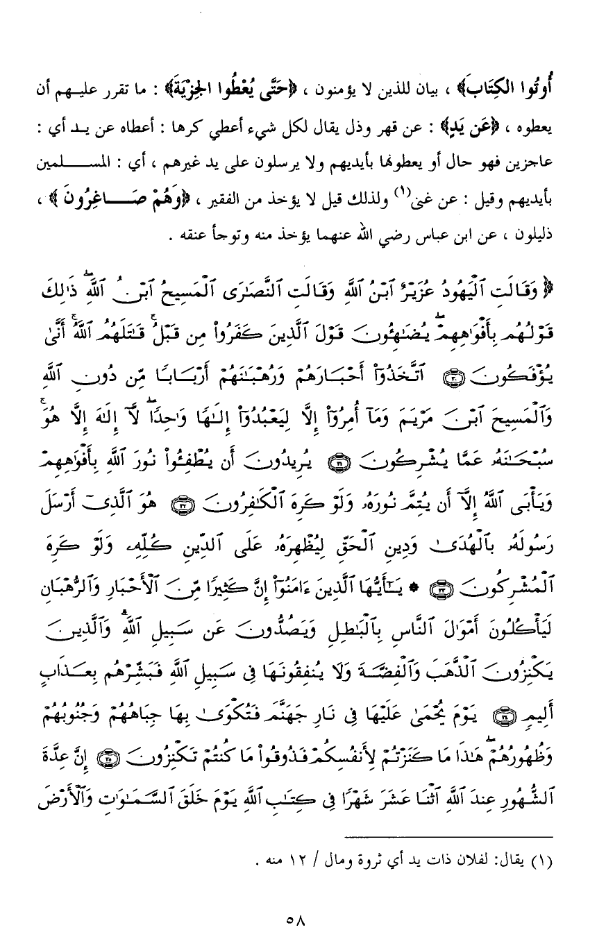(وَقَالَتِ الْيَهُودُ عُزَيْرٌ ابْنُ اللهِ وَقَالَتِ النَّصَارَى الْمَسِيحُ ابْنُ اللهِ ذَلِكَ قَوْلُهُمْ بِأَفْوَاهِهِمْ يُضَاهِئُونَ قَوْلَ الَّذِينَ كَفَرُوا مِنْ قَبْلُ قَاتَلَهُمُ اللهُ أَنَّى يُؤْفَكُونَ (30) اتَّخَذُوا أَحْبَارَهُمْ وَرُهْبَانَهُمْ أَرْبَابًا مِنْ دُونِ اللهِ وَالْمَسِيحَ ابْنَ مَرْيَمَ وَمَا أُمِرُوا إِلَّا لِيَعْبُدُوا إِلَهًا وَاحِدًا لَا إِلَهَ إِلَّا هُوَ سُبْحَانَهُ عَمَّا يُشْرِكُونَ (31) يُرِيدُونَ أَنْ يُطْفِئُوا نُورَ اللهِ بِأَفْوَاهِهِمْ وَيَأْبَى اللهُ إِلَّا أَنْ يُتِمَّ نُورَهُ وَلَوْ كَرِهَ الْكَافِرُونَ (32) هُوَ الَّذِي أَرْسَلَ رَسُولَهُ بِالْهُدَى وَدِينِ الْحَقِّ لِيُظْهِرَهُ عَلَى الدِّينِ كُلِّهِ وَلَوْ كَرِهَ الْمُشْرِكُونَ (33) يَا أَيُّهَا الَّذِينَ آمَنُوا إِنَّ كَثِيرًا مِنَ الْأَحْبَارِ وَالرُّهْبَانِ لَيَأْكُلُونَ أَمْوَالَ النَّاسِ بِالْبَاطِلِ وَيَصُدُّونَ عَنْ سَبِيلِ اللهِ وَالَّذِينَ يَكْنِزُونَ الذَّهَبَ وَالْفِضَّةَ وَلَا يُنْفِقُونَهَا فِي سَبِيلِ اللهِ فَبَشِّرْهُمْ بِعَذَابٍ أَلِيمٍ (34) يَوْمَ يُحْمَى عَلَيْهَا فِي نَارِ جَهَنَّمَ فَتُكْوَى بِهَا جِبَاهُهُمْ وَجُنُوبُهُمْ وَظُهُورُهُمْ هَذَا مَا كَنَزْتُمْ لِأَنْفُسِكُمْ فَذُوقُوا مَا كُنْتُمْ تَكْنِزُونَ (35) إِنَّ عِدَّةَ الشُّهُورِ عِنْدَ اللهِ اثْنَا عَشَرَ شَهْرًا فِي كِتَابِ اللهِ يَوْمَ خَلَقَ السَّمَاوَاتِ وَالْأَرْضَ