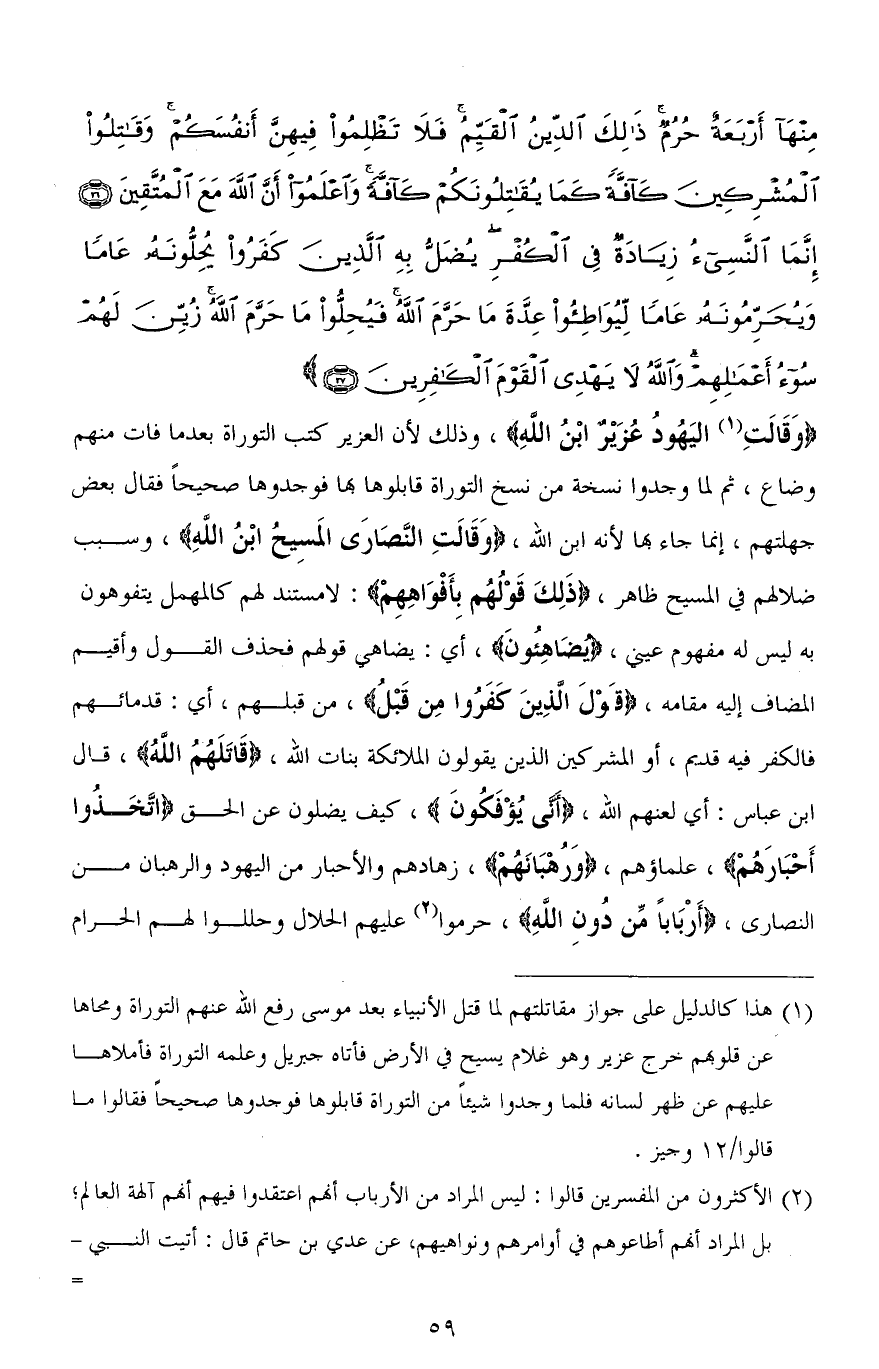 (وَقَالَتِ الْيَهُودُ عُزَيْرٌ ابْنُ اللهِ)، وذلك لأن العزير كتب التوراة بعدما فات منهم وضاع، ثم لما وجدوا نسخة من نسخ التوراة قابلوها بها فوجدوها صحيحاً فقال بعض جهلتهم، إنما جاء بها لأنه ابن الله، (وَقَالَتِ النَّصَارَى المَسِيحُ ابْنُ اللهِ)، وسبب ضلالهم في المسيح ظاهر، (ذَلِكَ قَوْلُهُم بِأَفْوَاهِهِمْ): لا مستند لهم كالمهمل يتفوهون به ليس له مفهوم عيني، (يُضَاهِئُونَ)، أي: يضاهي قولهم فحذف القول وأقيم المضاف إليه مقامه، (قَوْلَ الَّذِينَ كَفَرُوا مِنْ قَبْلُ)، من قبلهم، أي: قدمائهم فالكفر فيه قدم، أو المشركين الذين يقولون الملائكة بنات الله، (قَاتَلَهُمُ اللهُ)، قال ابن عباس: أي لعنهم الله، (أَنَّى يُؤْفَكُونَ)، كيف يضلون عن الحق (اتَّخَذُوا أَحْبَارَهُمْ)، علماؤهم، (وَرُهْبَانَهُمْ)، زهادهم والأحبار من اليهود والرهبان من النصارى، (أَرْبَابًا مِنْ دُونِ اللهِ)، حرموا عليهم الحلال وحللوا لهم الحرام