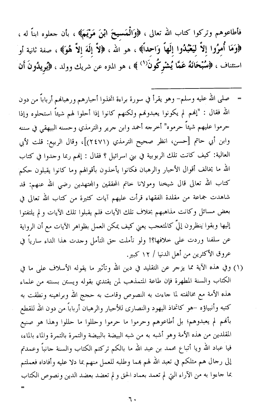 فأطاعوهم وتركوا كتاب الله تعالى، (وَالْمَسِيحَ ابْنَ مَرْيَمَ)، بأن جعلوه ابناً له، (وَمَا أُمِرُوا إِلَّا لِيَعْبُدُوا إِلَهًا وَاحِدًا)، هو الله، (لَا إِلَهَ إِلَّا هُوَ)، صفة ثانية أو استئناف، (سُبْحَانَهُ عَمَّا يُشْرِكُونَ)، هو المنزه عن شريك وولد، (يُرِيدُونَ أَنْ