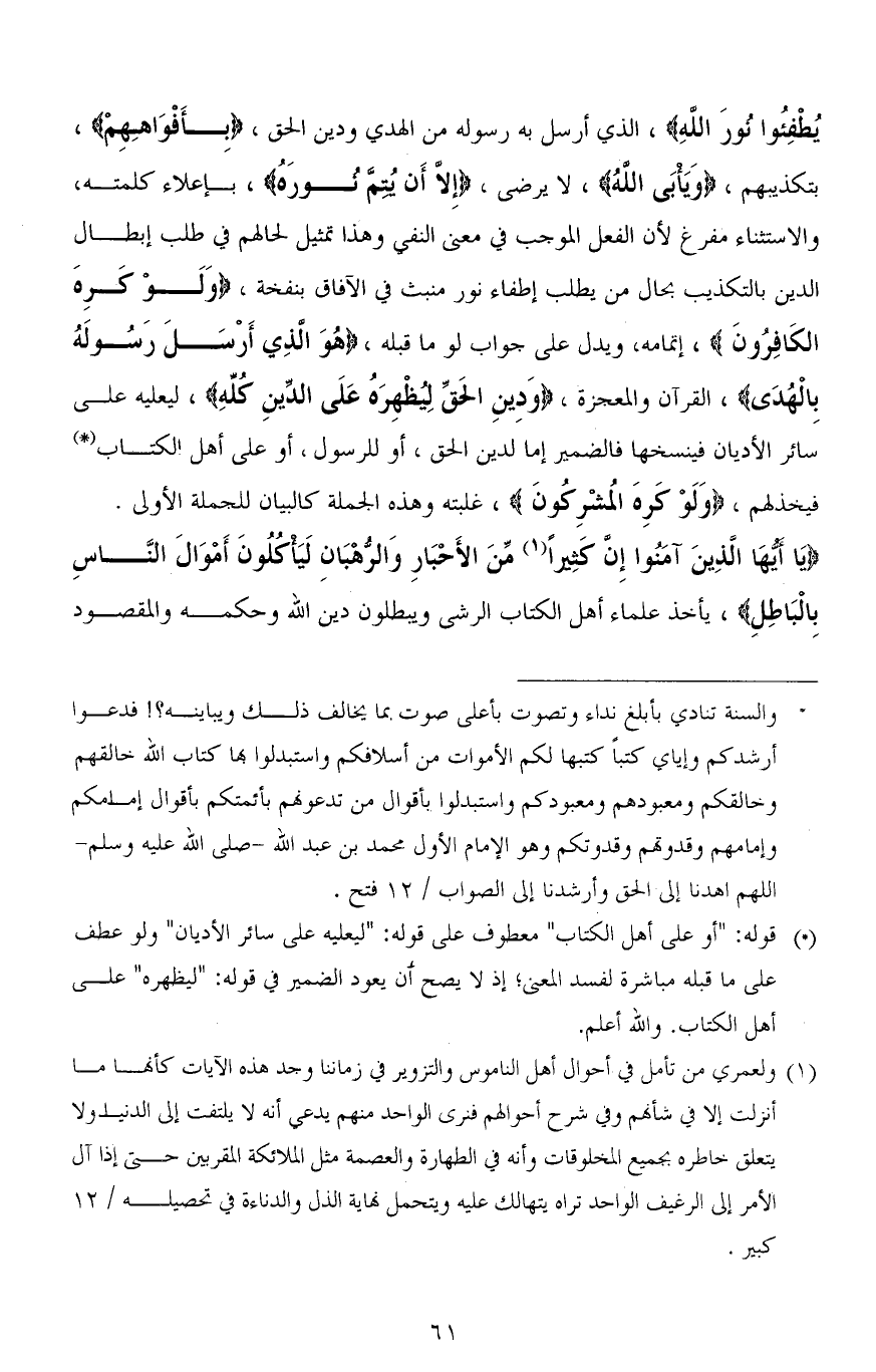 يُطْفِئُوا نُورَ اللهِ) الذي أرسل به رسوله من الهدي ودين الحق، (بِأَفْوَاهِهِمْ)، بتكذيبهم، (وَيَأْبَى اللهُ)، لا يرضى، (إِلَّا أَنْ يُتِمَّ نُورَهُ)، بإعلاء كلمته، والاستثناء مفرغ لأن الفعل الموجب في معنى النفي وهذا تمثيل لحالهم في طلب إبطال الدين بالتكذيب بحال من يطلب إطفاء نور منبث في الآفاق بنفخة، (وَلَوْ كَرِهَ الْكَافِرُونَ)، إتمامه، ويدل على جواب لو ما قبله، (هُوَ الَّذِي أَرْسَلَ رَسُولَهُ بِالْهُدَى)، القرآن والمعجزة، (وَدِينِ الحَقِّ لِيُظْهِرَهُ عَلَى الدِّينِ كُلِّهِ)، ليعليه على سائر الأديان فينسخها فالضمير إما لدين الحق، أو للرسول، أو على أهل الكتاب فيخذلهم، (وَلَوْ كَرِهَ الْمُشْرِكُونَ)، غلبته وهذه الجملة كالبيان للجملة الأولى.