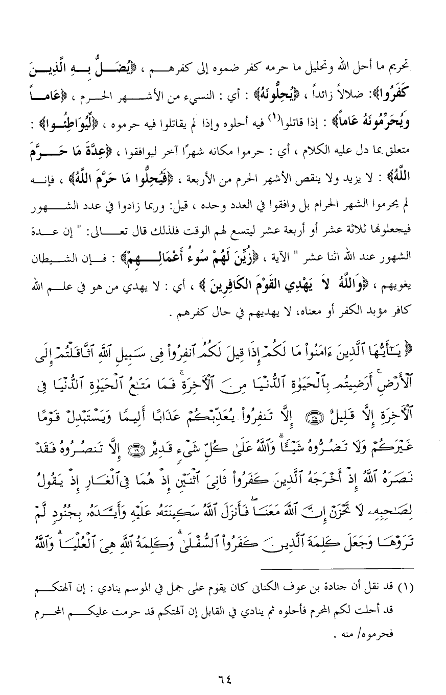 (يَا أَيُّهَا الَّذِينَ آمَنُوا مَا لَكُمْ إِذَا قِيلَ لَكُمُ انْفِرُوا فِي سَبِيلِ اللهِ اثَّاقَلْتُمْ إِلَى الْأَرْضِ أَرَضِيتُمْ بِالْحَيَاةِ الدُّنْيَا مِنَ الْآخِرَةِ فَمَا مَتَاعُ الْحَيَاةِ الدُّنْيَا فِي الْآخِرَةِ إِلَّا قَلِيلٌ (38) إِلَّا تَنْفِرُوا يُعَذِّبْكُمْ عَذَابًا أَلِيمًا وَيَسْتَبْدِلْ قَوْمًا غَيْرَكُمْ وَلَا تَضُرُّوهُ شَيْئًا وَاللهُ عَلَى كُلِّ شَيْءٍ قَدِيرٌ (39) إِلَّا تَنْصُرُوهُ فَقَدْ نَصَرَهُ اللهُ إِذْ أَخْرَجَهُ الَّذِينَ كَفَرُوا ثَانِيَ اثْنَيْنِ إِذْ هُمَا فِي الْغَارِ إِذْ يَقُولُ لِصَاحِبِهِ لَا تَحْزَنْ إِنَّ اللهَ مَعَنَا فَأَنْزَلَ اللهُ سَكِينَتَهُ عَلَيْهِ وَأَيَّدَهُ بِجُنُودٍ لَمْ تَرَوْهَا وَجَعَلَ كَلِمَةَ الَّذِينَ كَفَرُوا السُّفْلَى وَكَلِمَةُ اللهِ هِيَ الْعُلْيَا وَاللهُ عَزِيزٌ حَكِيمٌ (40)