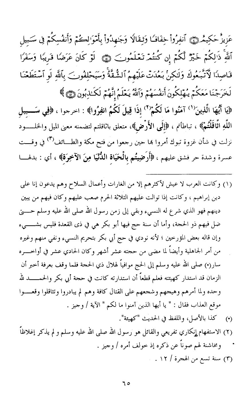 (يَا أَيُّهَا الَّذِينَ آمَنُوا مَا لَكُمْ إِذَا قِيلَ لَكُمُ انْفِرُوا): اخرجوا، (فِي سَبِيلِ اللهِ اثَّاقَلْتُمْ)، تباطأتم، (إِلَى الْأَرْضِ)، متعلق بـ اثاقلتم لتضمنه معنى الميل والخلود نزلت في شأن غزوه تبوك أمروا بها حين رجعوا من فتح مكة والطائف في وقت عسرة وشدة حر فشق عليهم، (أَرَضِيتُمْ بِالْحَيَاةِ الدُّنْيَا مِنَ الْآخِرَةِ)، أي: بدلها