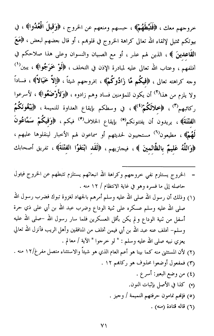 خروجهم معك، (فَثَبَّطَهُمْ)، حبسهم ومنعهم عن الخروج، (وَقِيلَ اقْعُدُوا)، في بيوتكم تمثيل لإلقاء الله تعالى كراهة الخروج في قلوبهم، أو قال بعضهم لبعض، (مَعَ الْقَاعِدِينَ)، الذين لهم عذر، أو مع الصبيان والنسوان وعلى هذا صلاحكم في تخلفهم، وعتاب الله تعالى عليه لمبادرة الإذن في التخلف، (لَوْ خرَجُوا)، يبين وجه كراهته تعالى، (فِيكُمْ مَا زَادُوكُمْ)، بخروجهم شيئاً، (إِلَّا خَبَالًا)، فساداً ولا يلزم من هذا أن يكون للمؤمنين فساد وهم زادوه، (وَلأَوْضَعُوا)، لأسرعوا ركائبهم، (خِلَالَكُمْ)، في وسطكم بإيقاع العداوة للنميمة، (يَبْغُونَكُمُ الْفِتْنَةَ)، يريدون أن يفتنوتكم بإيقاع الخلاف فيكم، (وَفِيكُمْ سَمَّاعُونَ لَهُمْ)، مطيعون مستجيبون لحديثهم أو سماعون لهم الأخبار لينقلوها عليهم، (وَاللهُ عَلِيمٌ بِالظَّالِمِينَ)، فيجازيهم، (لَقَدِ ابْتَغَوُا الفِتْنَةَ)، تفريق أصحابك