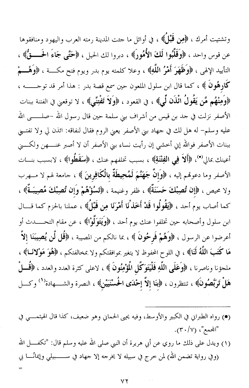 وتشتيت أمرك، (مِنْ قَبْلُ)، في أوائل ما جئت المدينة رمته العرب واليهود ومنافقوها عن قوس واحد، (وَقَلَّبُوا لَكَ الْأُمُورَ)، دبروا لك الحيل، (حَتَّى جَاءَ الحَقُّ)، التأييد الإلهى، (وَظَهَرَ أَمْرُ اللهِ)، وعلا كلمته يوم بدر ويوم فتح مكة، (وَهُمْ كَارِهُونَ)، كما قال ابن سلول الملعون حين سمع قصة بدر: هذا أمر قد توجه، (وَمِنْهُم مَّن يَقُولُ ائْذن لِّي)، في القعود، (وَلاَ تَفْتِنِّي)، لا توقعني في الفتنة ببنات الأصفر نزلت في جد بن قيس من أشراف بني سلمة حين قال رسول الله - صلى الله عليه وسلم - له هل لك في جهاد بني الأصفر يعني الروم فقال لنفاقه: ائذن لي ولا تفتني ببنات الأصفر فوالله إني أخشي إن رأيت نساء بني الأصفر أن لا أصبر عنهن ولكني أعينك بمالي، (أَلاَ فِي الفِتْنَةِ)، بسبب تخلفهم عنك، (سَقَطُوا)، لا بسبب بنات الأصفر وما دعوتهم إليه، (وَإِنْ جَهنمَ لَمُحِيطَةٌ بالْكَافِرِينَ) جامعة لهم لا مهرب ولا محيص، (إِن تُصِبْكَ حَسَنَةٌ)، ظفر وغنيمة، (تَسُؤْهُمْ وَإِن تُصِبْكَ مُصِيبَةٌ)، كما أصاب يوم أحد، (يَقُولُوا قَدْ أَخَذْنَا أَمْرَنَا مِنْ قَبْلُ)، عملنا بالحزم كما قال ابن سلول وأصحابه حين تخلفوا عنك يوم أحد، (وَيَتَوَلَّوْا)، عن مقام التحدث أو أعرضوا عن الرسول، (وَهُمْ فَرِحُونَ)، بما نالكم من المصيبة، (قُلْ لَنْ يُصِيبَنَا إِلَّا مَا كَتَبَ اللهُ لَنَا)، في اللوح المحفوظ لا يتغير بموافقتكم ولا بمخالفتكم، (هُوَ مَوْلَانَا)، ملجؤنا وناصرنا، (وَعَلَى اللهِ فَلْيَتَوَكلِ المُؤْمِنُونَ)، لا على كثرة العدد والعدد، (قُلْ هَلْ تَرَبَّصُونَ)، تنتظرون، (بِنَا إِلَّا إِحْدَى الْحُسْنَيَيْنِ)، النصرة والشهادة وكل