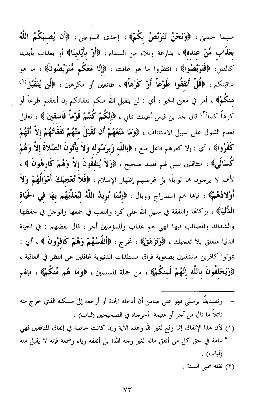 منهما حسنى، (وَنَحْنُ نَتَرَبَّصُ بِكُمْ)، إحدى السوءين، (أَنْ يُصِيبَكُمُ اللهُ بِعَذَابٍ مِنْ عِنْدِهِ)، بقارعة وبلاء من السماء، (أَوْ بِأَيْدِينَا) أو بعذاب بأيدينا كالقتل، (فَتَرَبَّصُوا)، انتظروا ما هو عاقبنا، (إِنَّا مَعَكُمْ مُتَرَبِّصُونَ)، ما هو عاقبتكم، (قُلْ أَنفِقوا طَوْعاً أَوْ كَرْهاً)، طائعين أو مكرهين، (لن يُتَقَبَّلَ مِنكُمْ)، أمر في معنى الخبر، أي: لن يتقبل الله منكم نفقاتكم إن أنفقتم طوعاً أو كرهًا كما قال جد بن قيس أعينك بمالي، (إِنَّكُمْ كُنْتُمْ قَوْمًا فَاسِقِينَ)، تعليل لعدم القبول على سبيل الاستئناف، (وَمَا مَنَعَهُمْ أَنْ تُقْبَلَ مِنْهُمْ نَفَقَاتُهُمْ إِلَّا أَنَّهُمْ كَفَرُوا)، أي: إلا كفرهم فاعل منع، (بِاللهِ وَبِرَسُولِهِ وَلَا يَأْتُونَ الصَّلَاةَ إِلَّا وَهُمْ كُسَالَى)، متثاقلين ليس لهم قصد صحيح، (وَلَا يُنْفِقُونَ إِلَّا وَهُمْ كَارِهُونَ)، لأنَّهُم لا يرجون بها ثواباً؛ بل غرضهم إظهار الإسلام، (فَلَا تُعْجِبْكَ أَمْوَالُهُمْ وَلَا أَوْلَادُهُمْ)، فإنها لهم استدراج ووبال، (إِنَّمَا يُرِيدُ اللهُ لِيُعَذِّبَهُمْ بِهَا فِي الْحَيَاةِ الدُّنْيَا)، بزكاتها والنفقة في سبيل الله على كره والتعب في جمعها والوجل في حفظها والشدائد والمصائب فيها فهي لهم عذاب وللمؤمنين أجر، قال بعضهم: في الحياة الدنيا متعلق بـ لا تعجبك، (وَتَزْهَقَ)، تخرج، (أَنفُسُهُمْ وَهُمْ كافِرُونَ)، أي: يموتوا كافرين مشتغلين بصعوبة فراق [المستلذات] الدنيوية غافلين عن النظر في العاقبة، (وَيَحْلِفُونَ بِاللهِ إِنَّهُمْ لَمِنكُمْ)، من جملة المسلمين، (وَمَا هُم مِّنكمْ)، فإنهم