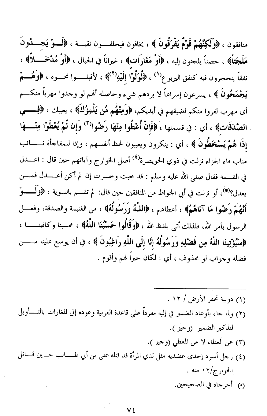 منافقون، (وَلَكِنَّهُمْ قَوْمٌ يَفْرَقُونَ)، يخافون فيحلفون تقية، (لَوْ يَجِدُونَ مَلْجَأً)، حصنًا يلجئون إليه، (أَوْ مَغَارَاتٍ)، غيرانًا في الجبال، (أَوْ مُدَّخَلًا)، نفقاَ ينحجرون فيه كنفق اليربوع، (لَوَلَّوْا إِلَيْهِ)، لأقبلوا نحوه، (وَهُم يَجْمَحُون)، يسرعون إسراعًا لا يردهم شيء وحاصله أنَّهم لو وجدوا مهربًا منكم أى مهرب لفروا منكم لضيقهم في أيديكم، (وَمِنْهُمْ مَنْ يَلْمِزُكَ)، يعيبك، (فِي الصَّدَقَاتِ)، أي: في قسمتها، (فَإِنْ أُعْطُوا مِنْهَا رَضُوا وَإِنْ لَمْ يُعْطَوْا مِنْهَا إِذَا هُمْ يَسْخَطُونَ)، أي: ينكرون ويعيبون لحظ أنفسهم، وإذا للمفاجأة نائب مناب فاء الجزاء نزلت في ذوى الخويصرة أصل الخوارج وآبائهم حين قال: اعدل في القسمة فقال صلى الله عليه وسلم: قد خبتَ وخسرتَ إن لم أكن أعدل فمن يعدل؟، أو نزلت في أبي الجواظ من المنافقين حين قال: أتقسم بالسوية، (وَلَوْ أَنَّهُمْ رَضُوا مَا آتَاهُمُ)، أعطاهم، (اللهُ وَرَسُولُهُ)، من الغنيمة والصدقة، وفعل الرسول بأمر الله، فلذلك أتى بلفظ الله، (وَقَالُوا حَسْبُنَا اللهُ)، محسبنا وكافينا، (سَيُؤْتِينَا اللهُ مِنْ فَضْلِهِ وَرَسُولُهُ إِنَّا إِلَى اللهِ رَاغِبُونَ)، في أن يوسع علينا من فضله وجواب لو محذوف، أي: لكان خيرًا لهم وأقوم.