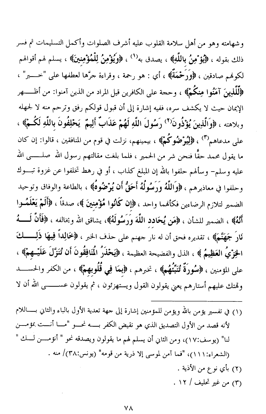 وشهامته وهو من أهل سلامة القلوب عليه أشرف الصلوات وأكمل التسليمات ثم فسر ذلك بقوله، (يُؤْمِنُ بِاللهِ)، يصدق به، (وَيُؤْمِنُ لِلْمُؤْمِنِينَ)، يسلم لهم أقوالهم لكونهم صادقين، (وَرحْمَةٌ)، أي: هو رحمة، وقراءة جرِّها لعطفها على " خير "، (لِلَّذِينَ آمَنُوا مِنْكُمْ)، وحجة على الكافرين قيل المراد من الذين آمنوا: من أظهر الإيمان حيث لا يكشف سره، ففيه إشارة إلى أن قبول قولكم رفق وترحم منه لا لجهله وبلاهته، (وَالَّذِينَ يُؤْذُونَ رَسُولَ اللهِ لَهُمْ عَذَابٌ أَلِيمٌ (61) يَحْلِفُونَ بِاللهِ لَكُمْ)، على مدعاهم، (لِيُرْضُوكُمْ)، بيمينهم، نزلت في قوم من المنافقين، قالوا: إن كان ما يقول محمد حقًّا فنحن شر من الحمير، فلما بلغت مقالتهم رسول الله صلى الله عليه وسلم - وسألهم حلفوا بالله إن المبلِّغ كذاب، أو في رهط تخلفوا عن غزوة تبوك وحلفوا في معاذيرهم، (وَاللهُ وَرَسُولُهُ أَحَقُّ أَنْ يُرْضُوهُ)، بالطاعة والوفاق وتوحيد الضمير لتلازم الرضاءين فكأنهما واحد، (إِنْ كَانُوا مُؤْمِنِينَ)، صدقًا، (أَلَمْ يَعْلَمُوا أَنَّهُ)، الضمير للشأن، (مَن يُحَادِدِ الله وَرَسولَهُ)، يشاقق الله ويخالفه، (فَأَنَّ لَهُ نَارَ جَهَنَّمَ)، تقديره فحق أن له نار جهنم على حذف الخبر، (خَالِدًا فِيهَا ذَلِكَ الْخِزْيُ الْعَظِيمُ)، الذل والفضيحة العظيمة، (يَحْذَرُ الْمُنَافِقُونَ أَنْ تُنَزَّلَ عَلَيْهِم)، على المؤمنين، (سُورَةٌ تُنَبِّئُهُمْ)، تخبرهم، (بِمَا فِي قُلُوبِهِمْ)، من الكفر والحسد وتهتك عليهم أستارهم يعني يقولون القول ويستهزئون، ثم يقولون عسى الله أن لا
