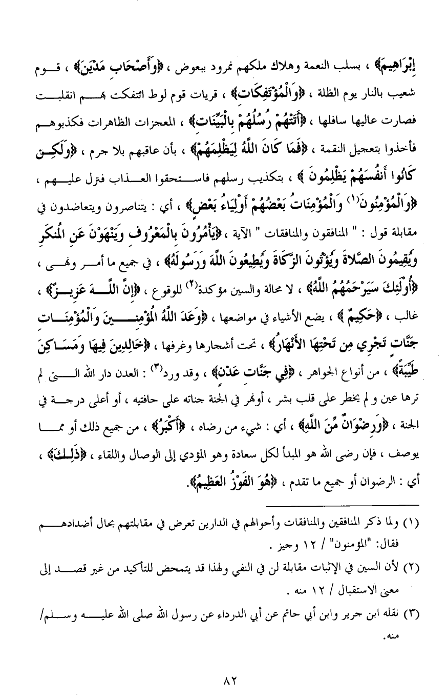 إِبْرَاهِيمَ)، بسلب النعمة وهلاك ملكهم نمرود ببعوض، (وَأَصْحَابِ مَدْيَنَ)، قوم شعيب بالنار يوم الظلة، (وَالْمُؤْتَفِكَاتِ)، قريات قوم لوط ائتفكت بهم انقلبت فصارت عاليها سافلها، (أَتَتْهُمْ رُسُلُهُمْ بِالْبَيِّنَاتِ)، المعجزات الظاهرات فكذبوهم فأخذوا بتعجيل النقمة، (فَمَا كَانَ اللهُ لِيَظْلِمَهُمْ)، بأن عاقبهم بلا جرم، (وَلَكِنْ كَانُوا أَنْفُسَهُمْ يَظْلِمُونَ)، بتكذيب رسلهم فاستحقوا العذاب فنزل عليهم، (وَالْمُؤْمِنُونَ وَالْمُؤْمِنَاتُ بَعْضُهُمْ أَوْلِيَاءُ بَعْضٍ)، أي: يتناصرون ويتعاضدون في مقابلة قول: " المنافقون والمنافقات " الآية، (يَأْمُرُونَ بِالْمَعْرُوفِ وَيَنْهَوْنَ عَنِ الْمُنْكَرِ وَيُقِيمُونَ الصَّلَاةَ وَيُؤْتُونَ الزَّكَاةَ وَيُطِيعُونَ اللهَ وَرَسُولَهُ)، في جميع ما أمر ونهي (أُولَئِكَ سَيَرْحَمُهُمُ اللهُ)، لا محالة والسين مؤكدة للوقوع، (إِنَّ اللهَ عَزِيزٌ)، غالب، (حَكِيمٌ)، يضع الأشياء في مواضعها، (وَعَدَ اللهُ الْمُؤْمِنِينَ وَالْمُؤْمِنَاتِ جَنَّاتٍ تَجْرِي مِنْ تَحْتِهَا الْأَنْهَارُ)، تحت أشجارها وغرفها، (خَالِدِينَ فِيهَا وَمَسَاكِنَ طَيبَةً)، من أنواع الجواهر، (فِي جَنَّاتِ عَدْن)، وقد ورد: العدن دار الله التي لم ترها عين ولم يخطر على قلب بشر، أو نهر في الجنة جناته على حافتيه، أو أعلى درجة في الجنة، (وَرِضْوَانٌ من اللهِ)، أي: شيء من رضاه، (أَكْبَرُ)، من جميع ذلك أو مما يوصف، فإن رضى الله هو المبدأ لكل سعادة وهو المؤدي إلى الوصال واللقاء، (ذلِكَ)، أى: الرضوان أو جميع ما تقدم، (هُوَ الفَوْزُ العَظِيمُ).