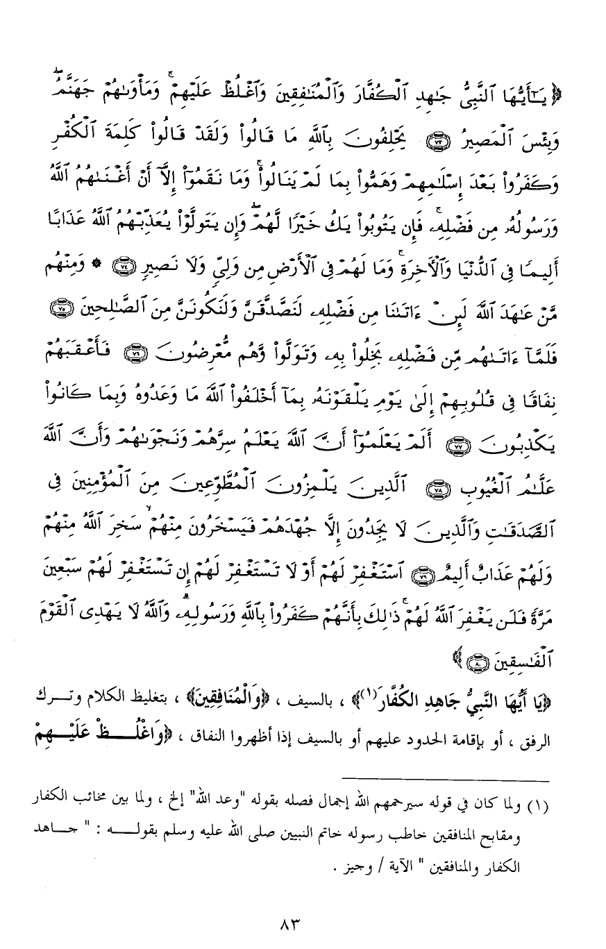 (ييَا أَيُّهَا النَّبِيُّ جَاهِدِ الْكُفَّارَ وَالْمُنَافِقِينَ وَاغْلُظْ عَلَيْهِمْ وَمَأْوَاهُمْ جَهَنَّمُ وَبِئْسَ الْمَصِيرُ (73) يَحْلِفُونَ بِاللهِ مَا قَالُوا وَلَقَدْ قَالُوا كَلِمَةَ الْكُفْرِ وَكَفَرُوا بَعْدَ إِسْلَامِهِمْ وَهَمُّوا بِمَا لَمْ يَنَالُوا وَمَا نَقَمُوا إِلَّا أَنْ أَغْنَاهُمُ اللهُ وَرَسُولُهُ مِنْ فَضْلِهِ فَإِنْ يَتُوبُوا يَكُ خَيْرًا لَهُمْ وَإِنْ يَتَوَلَّوْا يُعَذِّبْهُمُ اللهُ عَذَابًا أَلِيمًا فِي الدُّنْيَا وَالْآخِرَةِ وَمَا لَهُمْ فِي الْأَرْضِ مِنْ وَلِيٍّ وَلَا نَصِيرٍ (74) وَمِنْهُمْ مَنْ عَاهَدَ اللهَ لَئِنْ آتَانَا مِنْ فَضْلِهِ لَنَصَّدَّقَنَّ وَلَنَكُونَنَّ مِنَ الصَّالِحِينَ (75) فَلَمَّا آتَاهُمْ مِنْ فَضْلِهِ بَخِلُوا بِهِ وَتَوَلَّوْا وَهُمْ مُعْرِضُونَ (76) فَأَعْقَبَهُمْ نِفَاقًا فِي قُلُوبِهِمْ إِلَى يَوْمِ يَلْقَوْنَهُ بِمَا أَخْلَفُوا اللهَ مَا وَعَدُوهُ وَبِمَا كَانُوا يَكْذِبُونَ (77) أَلَمْ يَعْلَمُوا أَنَّ اللهَ يَعْلَمُ سِرَّهُمْ وَنَجْوَاهُمْ وَأَنَّ اللهَ عَلَّامُ الْغُيُوبِ (78) الَّذِينَ يَلْمِزُونَ الْمُطَّوِّعِينَ مِنَ الْمُؤْمِنِينَ فِي الصَّدَقَاتِ وَالَّذِينَ لَا يَجِدُونَ إِلَّا جُهْدَهُمْ فَيَسْخَرُونَ مِنْهُمْ سَخِرَ اللهُ مِنْهُمْ وَلَهُمْ عَذَابٌ أَلِيمٌ (79) اسْتَغْفِرْ لَهُمْ أَوْ لَا تَسْتَغْفِرْ لَهُمْ إِنْ تَسْتَغْفِرْ لَهُمْ سَبْعِينَ مَرَّةً فَلَنْ يَغْفِرَ اللهُ لَهُمْ ذَلِكَ بِأَنَّهُمْ كَفَرُوا بِاللهِ وَرَسُولِهِ وَاللهُ لَا يَهْدِي الْقَوْمَ الْفَاسِقِينَ (80)
