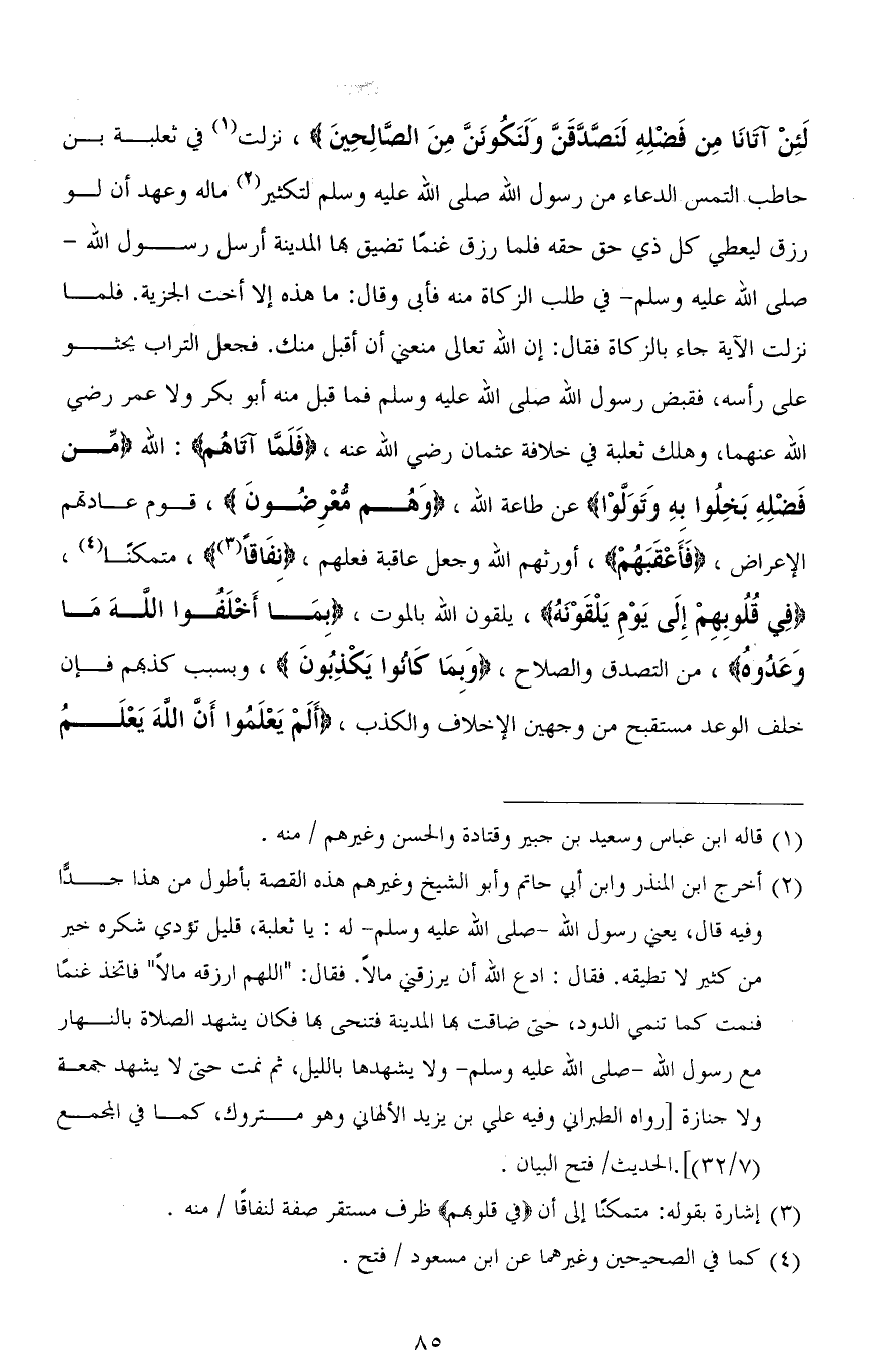 لَئِنْ آتَانَا مِنْ فَضْلِهِ لَنَصَّدَّقَنَّ وَلَنَكُونَنَّ مِنَ الصَّالِحِينَ)، نزلت في ثعلبة بن حاطب التمس الدعاء من رسول الله صلى الله عليه وسلم لتكثير ماله وعهد أن لو رزق ليعطي كل ذي حق حقه فلما رزق غنمًا تضيق بها المدينة أرسل رسول الله - صلى الله عليه وسلم - في طلب الزكاة منه فأبى وقال: ما هذه إلا أخت الجزية. فلما نزلت الآية جاء بالزكاة فقال: إن الله تعالى منعني أن أقبل منك. فجعل التراب يحثو على رأسه، فقبض رسول الله صلى الله عليه وسلم فما قبل منه أبو بكر ولا عمر رضي الله عنهما، وهلك ثعلبة في خلافة عثمان رضى الله عنه، (فَلَمَّا آتَاهُمْ): الله (مِنْ فَضْلِهِ بَخِلُوا بِهِ وَتَوَلَّوْا) عن طاعة الله، (وَهُم مُّعْرِضُونَ)، قوم عادتهم الإعراض، (فَأعْقَبَهُمْ)، أورثهم الله وجعل عاقبة فعلهم، (نِفاقًا)، متمكنًا، (فِي قُلُوبِهِمْ إِلَى يَوْمِ يَلْقَوْنَهُ)، يلقون الله بالموت، (بِمَا أَخْلَفُوا اللهَ مَا وَعَدُوهُ)، من التصدق والصلاح، (وَبِمَا كَانُوا يَكْذِبُونَ)، وبسبب كذبهم فإن خلف الوعد مستقبح من وجهين الإخلاف والكذب، (أَلَمْ يَعْلَمُوا أَنَّ اللهَ يَعْلَمُ