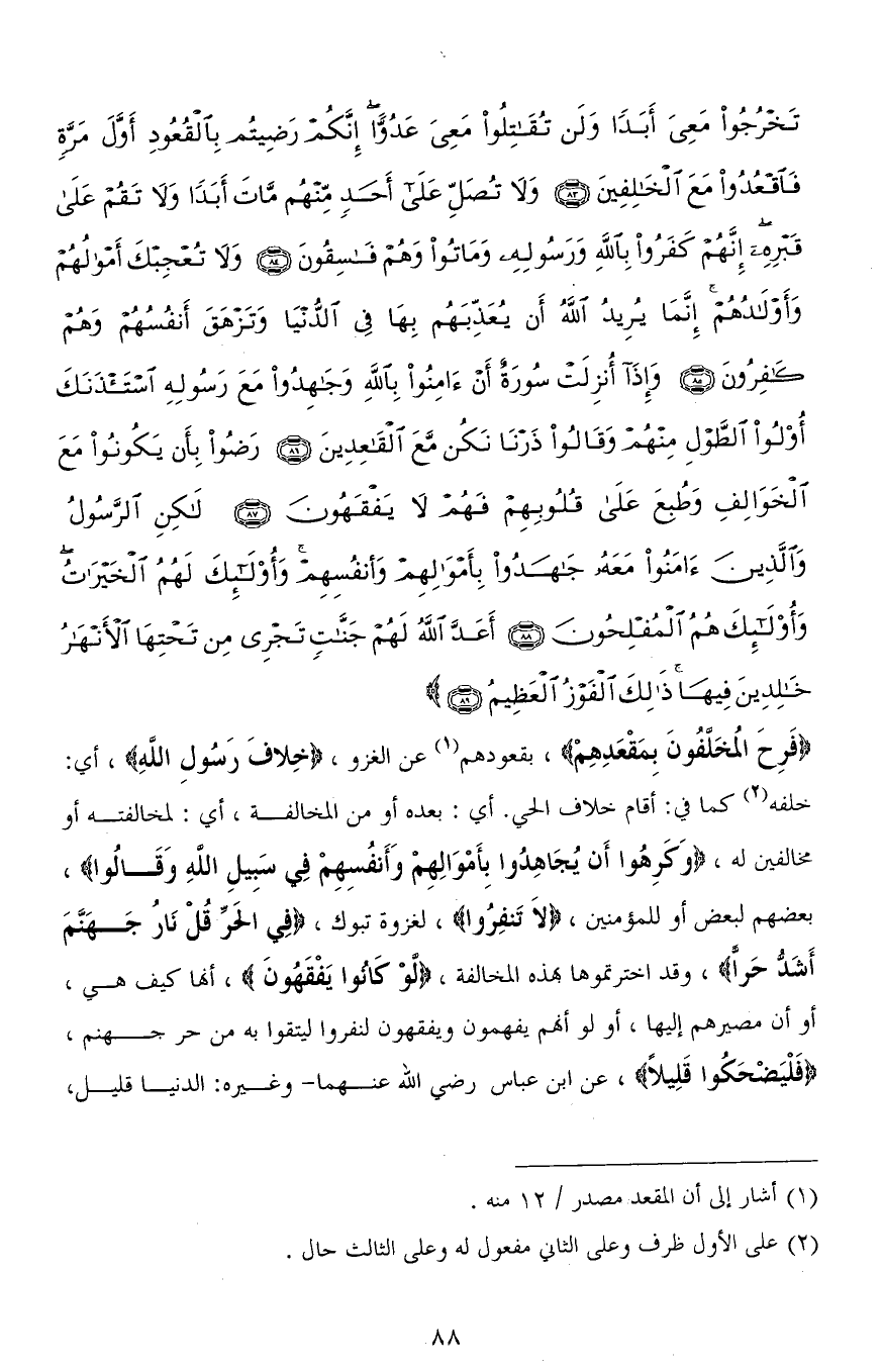 لَنْ تَخْرُجُوا مَعِيَ أَبَدًا وَلَنْ تُقَاتِلُوا مَعِيَ عَدُوًّا إِنَّكُمْ رَضِيتُمْ بِالْقُعُودِ أَوَّلَ مَرَّةٍ فَاقْعُدُوا مَعَ الْخَالِفِينَ (83) وَلَا تُصَلِّ عَلَى أَحَدٍ مِنْهُمْ مَاتَ أَبَدًا وَلَا تَقُمْ عَلَى قَبْرِهِ إِنَّهُمْ كَفَرُوا بِاللهِ وَرَسُولِهِ وَمَاتُوا وَهُمْ فَاسِقُونَ (84) وَلَا تُعْجِبْكَ أَمْوَالُهُمْ وَأَوْلَادُهُمْ إِنَّمَا يُرِيدُ اللهُ أَنْ يُعَذِّبَهُمْ بِهَا فِي الدُّنْيَا وَتَزْهَقَ أَنْفُسُهُمْ وَهُمْ كَافِرُونَ (85) وَإِذَا أُنْزِلَتْ سُورَةٌ أَنْ آمِنُوا بِاللهِ وَجَاهِدُوا مَعَ رَسُولِهِ اسْتَأْذَنَكَ أُولُو الطَّوْلِ مِنْهُمْ وَقَالُوا ذَرْنَا نَكُنْ مَعَ الْقَاعِدِينَ (86) رَضُوا بِأَنْ يَكُونُوا مَعَ الْخَوَالِفِ وَطُبِعَ عَلَى قُلُوبِهِمْ فَهُمْ لَا يَفْقَهُونَ (87) لَكِنِ الرَّسُولُ وَالَّذِينَ آمَنُوا مَعَهُ جَاهَدُوا بِأَمْوَالِهِمْ وَأَنْفُسِهِمْ وَأُولَئِكَ لَهُمُ الْخَيْرَاتُ وَأُولَئِكَ هُمُ الْمُفْلِحُونَ (88) أَعَدَّ اللهُ لَهُمْ جَنَّاتٍ تَجْرِي مِنْ تَحْتِهَا الْأَنْهَارُ خَالِدِينَ فِيهَا ذَلِكَ الْفَوْزُ الْعَظِيمُ (89)