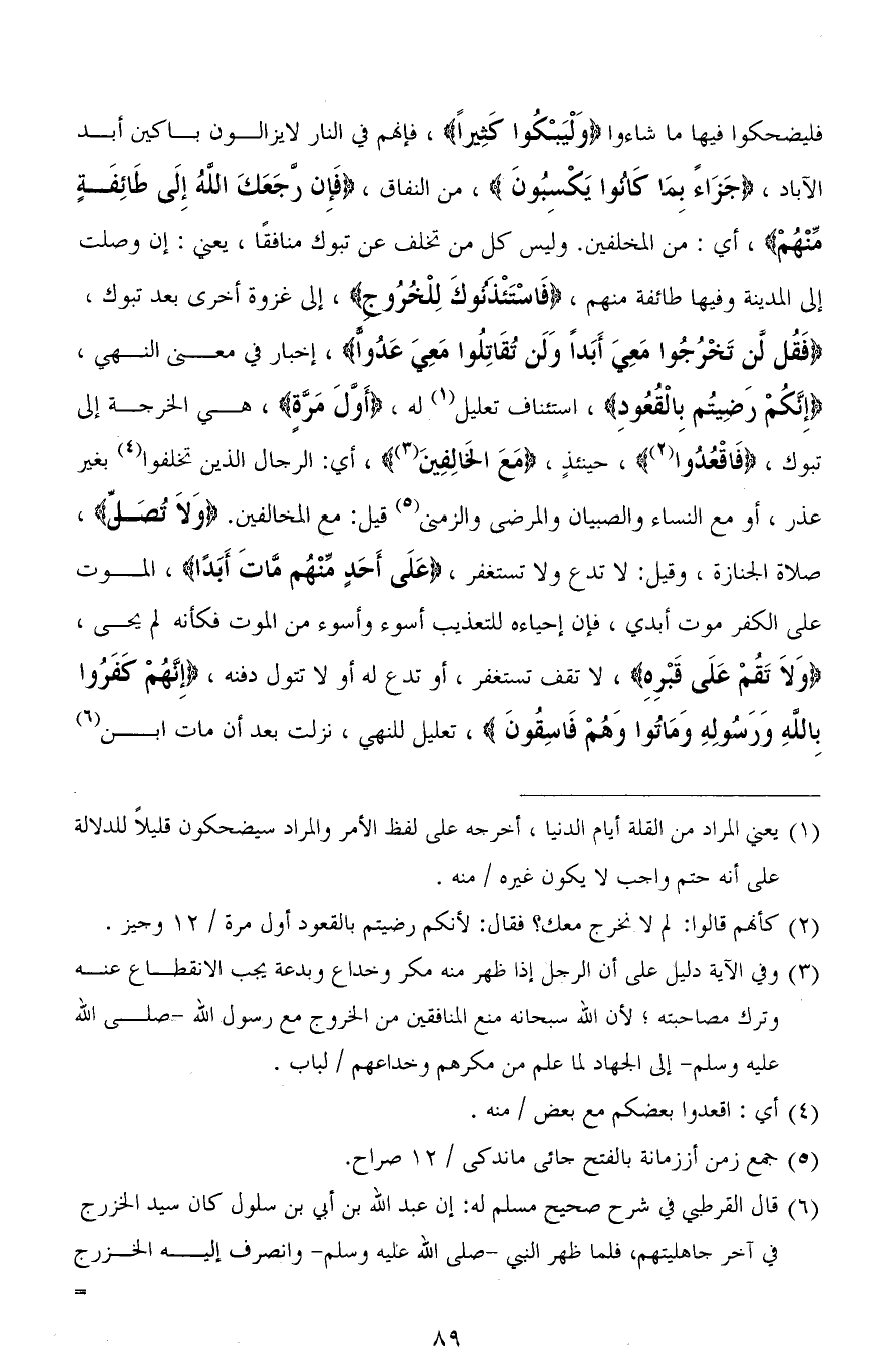 فليضحكوا فيها ما شاءوا (وَلْيَبْكُوا كَثِيرًا)، فإنهم في النار لا يزالون باكين أبد الآباد، (جَزَاءً بِمَا كَانُوا يَكْسِبُونَ)، من النفاق، (فَإِنْ رَجَعَكَ اللهُ إِلَى طَائِفَةٍ مِنْهُمْ)، أي: من المخلفين. وليس كل من تخلف عن تبوك منافقًا، يعني: إن وصلت إلى المدينة وفيها طائفة منهم، (فَاسْتَأْذَنُوكَ لِلْخُرُوجِ)، إلى غزوة أخرى بعد تبوك، (فَقُلْ لَنْ تَخْرُجُوا مَعِيَ أَبَدًا وَلَنْ تُقَاتِلُوا مَعِيَ عَدُوًّا)، إخبار في معنى النهي، (إِنَّكُمْ رَضِيتُمْ بِالْقُعُودِ)، استئناف تعليل له، (أَوَّلَ مَرَّةٍ)، هي الخرجة إلى تبوك، (فَاقْعُدُوا)، حينئذٍ، (مَعَ الْخَالِفِينَ)، أي: الرجال الذين تخلفوا بغير عذر، أو مع النساء والصبيان والمرضى والزمنى قيل: مع المخالفين. (وَلَا تُصَلِّ)، صلاة الجنازة، وقيل: لا تدع ولا تستغفر، (عَلَى أَحَدٍ منْهم مَّاتَ أَبَدًا)، الموت على الكفر موت أبدي، فإن إحياءه للتعذيب أسوأ وأسوأ من الموت فكأنه لم يحيى، (وَلاَ تَقُمْ عَلَى قَبْرِهِ)، لا تقف تستغفر، أو تدع له أو لا تتول دفنه، (إِنَّهُمْ كَفَرُوا بِاللهِ وَرَسُولِهِ وَمَاتُوا وَهُمْ فَاسِقُونَ)، تعليل للنهي، نزلت بعد أن مات ابن