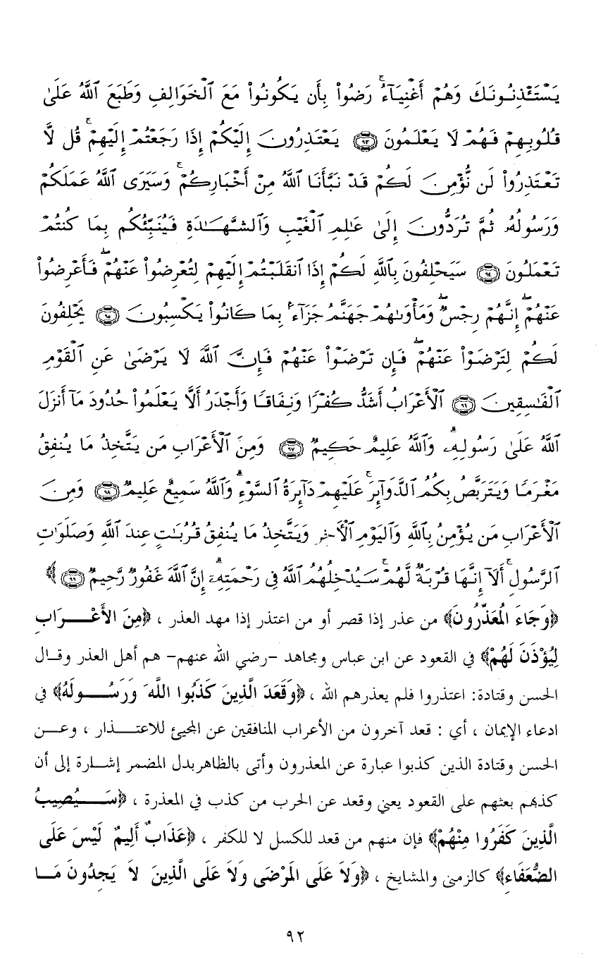 يَسْتَأْذِنُونَكَ وَهُمْ أَغْنِيَاءُ رَضُوا بِأَنْ يَكُونُوا مَعَ الْخَوَالِفِ وَطَبَعَ اللهُ عَلَى قُلُوبِهِمْ فَهُمْ لَا يَعْلَمُونَ (93) يَعْتَذِرُونَ إِلَيْكُمْ إِذَا رَجَعْتُمْ إِلَيْهِمْ قُلْ لَا تَعْتَذِرُوا لَنْ نُؤْمِنَ لَكُمْ قَدْ نَبَّأَنَا اللهُ مِنْ أَخْبَارِكُمْ وَسَيَرَى اللهُ عَمَلَكُمْ وَرَسُولُهُ ثُمَّ تُرَدُّونَ إِلَى عَالِمِ الْغَيْبِ وَالشَّهَادَةِ فَيُنَبِّئُكُمْ بِمَا كُنْتُمْ تَعْمَلُونَ (94) سَيَحْلِفُونَ بِاللهِ لَكُمْ إِذَا انْقَلَبْتُمْ إِلَيْهِمْ لِتُعْرِضُوا عَنْهُمْ فَأَعْرِضُوا عَنْهُمْ إِنَّهُمْ رِجْسٌ وَمَأْوَاهُمْ جَهَنَّمُ جَزَاءً بِمَا كَانُوا يَكْسِبُونَ (95) يَحْلِفُونَ لَكُمْ لِتَرْضَوْا عَنْهُمْ فَإِنْ تَرْضَوْا عَنْهُمْ فَإِنَّ اللهَ لَا يَرْضَى عَنِ الْقَوْمِ الْفَاسِقِينَ (96) الْأَعْرَابُ أَشَدُّ كُفْرًا وَنِفَاقًا وَأَجْدَرُ أَلَّا يَعْلَمُوا حُدُودَ مَا أَنْزَلَ اللهُ عَلَى رَسُولِهِ وَاللهُ عَلِيمٌ حَكِيمٌ (97) وَمِنَ الْأَعْرَابِ مَنْ يَتَّخِذُ مَا يُنْفِقُ مَغْرَمًا وَيَتَرَبَّصُ بِكُمُ الدَّوَائِرَ عَلَيْهِمْ دَائِرَةُ السَّوْءِ وَاللهُ سَمِيعٌ عَلِيمٌ (98) وَمِنَ الْأَعْرَابِ مَنْ يُؤْمِنُ بِاللهِ وَالْيَوْمِ الْآخِرِ وَيَتَّخِذُ مَا يُنْفِقُ قُرُبَاتٍ عِنْدَ اللهِ وَصَلَوَاتِ الرَّسُولِ أَلَا إِنَّهَا قُرْبَةٌ لَهُمْ سَيُدْخِلُهُمُ اللهُ فِي رَحْمَتِهِ إِنَّ اللهَ غَفُورٌ رَحِيمٌ (99)