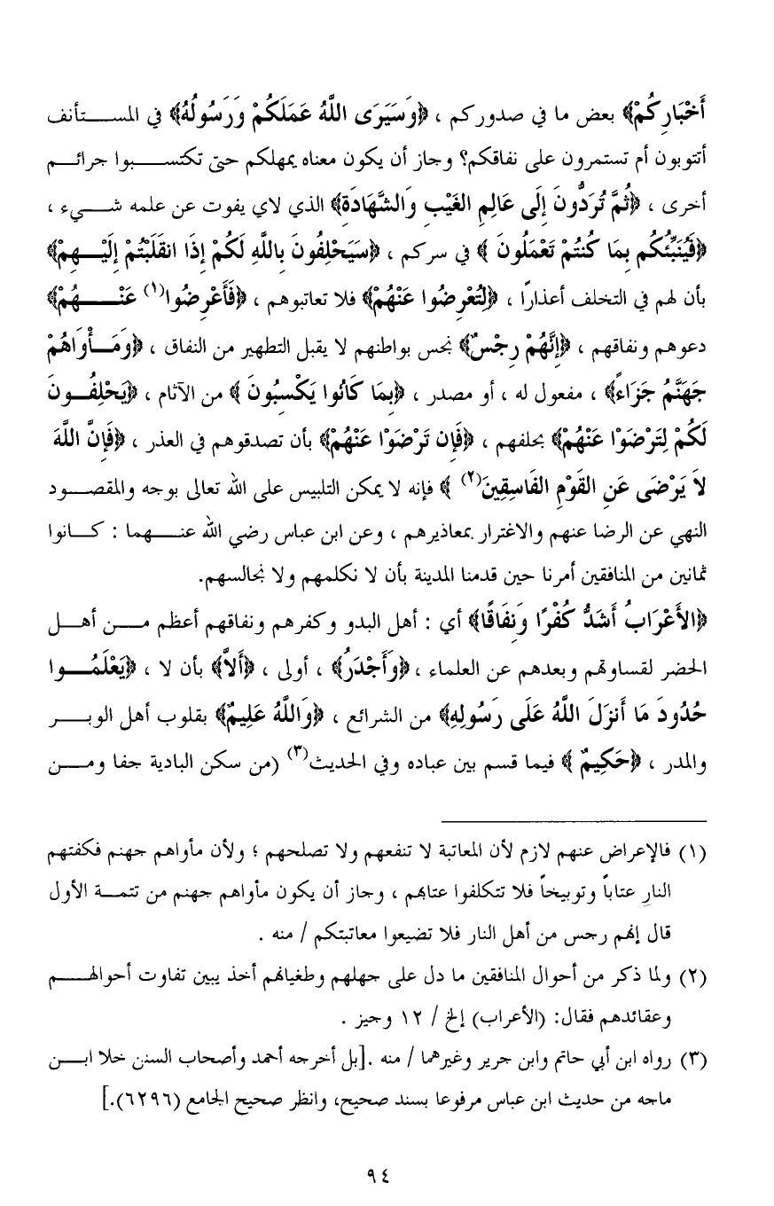 أَخْبَارِكُمْ) بعض ما في صدوركم، (وَسَيَرَى اللهُ عَمَلَكُمْ وَرَسُولُهُ) في المستأنف أتتوبون أم تستمرون على نفاقكم؟ وجاز أن يكون معناه يمهلكم حتى تكتسبوا جرائم أخرى، (ثُمَّ تُرَدُّونَ إِلَى عَالِمِ الْغَيْبِ وَالشَّهَادَةِ) الذي [لا] يفوت عن علمه شيء، (فَيُنَبِّئُكُمْ بِمَا كُنْتُمْ تَعْمَلُونَ) في سركم، (سَيَحْلِفُونَ بِاللهِ لَكُمْ إِذَا انْقَلَبْتُمْ إِلَيْهِمْ) بأن لهم في التخلف أعذارًا، (لتعْرِضُوا عَنْهُمْ) فلا تعاتبوهم، (فأَعْرِضُوا عَنْهُمْ) دعوهم ونفاقهم، (إِنَّهُمْ رِجْسٌ) نجس بواطنهم لا يقبل التطهير من النفاق، (وَمَأْوَاهُمْ جَهَنَّمُ جَزَاءً)، مفعول له، أو مصدر، (بِمَا كَانُوا يكْسِبُونَ) من الآثام، (يَحْلِفُونَ لَكُمْ لِتَرْضَوْا عَنْهُمْ) بحلفهم، (فَإِنْ تَرْضَوْا عَنْهُمْ) بأن تصدقوهم في العذر، (فَإِنَّ اللهَ لَا يَرْضَى عَنِ الْقَوْمِ الْفَاسِقِينَ) فإنه لا يمكن التلبيس على الله تعالى بوجه والمقصود النهي عن الرضا عنهم والاغترار بمعاذيرهم، وعن ابن عباس رضى الله عنهما: كانوا ثمانين من المنافقين أمرنا حين قدمنا المدينة بأن لا نكلمهم ولا نجالسهم.