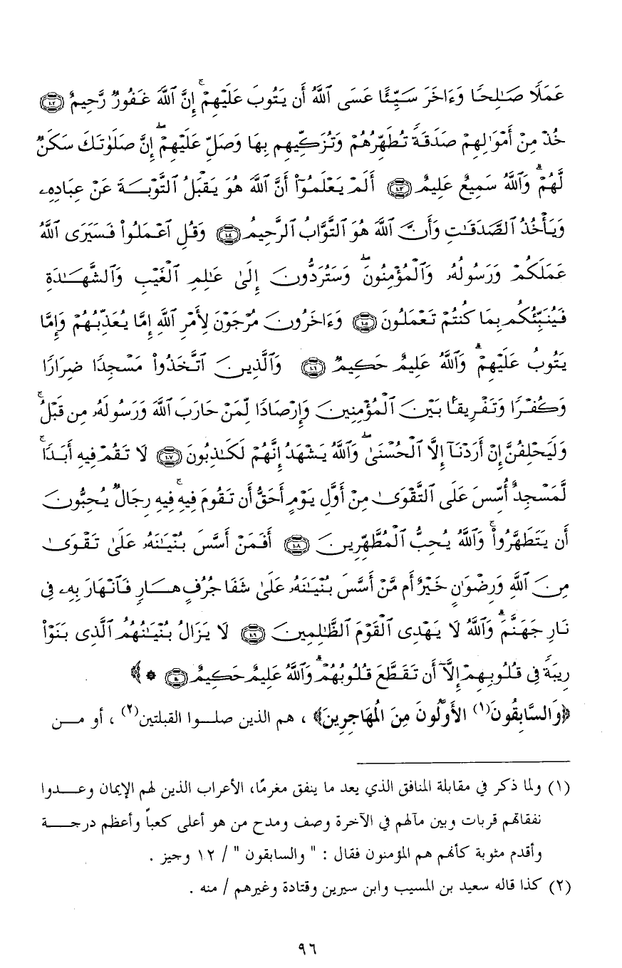 عَمَلًا صَالِحًا وَآخَرَ سَيِّئًا عَسَى اللهُ أَنْ يَتُوبَ عَلَيْهِمْ إِنَّ اللهَ غَفُورٌ رَحِيمٌ (102) خُذْ مِنْ أَمْوَالِهِمْ صَدَقَةً تُطَهِّرُهُمْ وَتُزَكِّيهِمْ بِهَا وَصَلِّ عَلَيْهِمْ إِنَّ صَلَاتَكَ سَكَنٌ لَهُمْ وَاللهُ سَمِيعٌ عَلِيمٌ (103) أَلَمْ يَعْلَمُوا أَنَّ اللهَ هُوَ يَقْبَلُ التَّوْبَةَ عَنْ عِبَادِهِ وَيَأْخُذُ الصَّدَقَاتِ وَأَنَّ اللهَ هُوَ التَّوَّابُ الرَّحِيمُ (104) وَقُلِ اعْمَلُوا فَسَيَرَى اللهُ عَمَلَكُمْ وَرَسُولُهُ وَالْمُؤْمِنُونَ وَسَتُرَدُّونَ إِلَى عَالِمِ الْغَيْبِ وَالشَّهَادَةِ فَيُنَبِّئُكُمْ بِمَا كُنْتُمْ تَعْمَلُونَ (105) وَآخَرُونَ مُرْجَوْنَ لِأَمْرِ اللهِ إِمَّا يُعَذِّبُهُمْ وَإِمَّا يَتُوبُ عَلَيْهِمْ وَاللهُ عَلِيمٌ حَكِيمٌ (106) وَالَّذِينَ اتَّخَذُوا مَسْجِدًا ضِرَارًا وَكُفْرًا وَتَفْرِيقًا بَيْنَ الْمُؤْمِنِينَ وَإِرْصَادًا لِمَنْ حَارَبَ اللهَ وَرَسُولَهُ مِنْ قَبْلُ وَلَيَحْلِفُنَّ إِنْ أَرَدْنَا إِلَّا الْحُسْنَى وَاللهُ يَشْهَدُ إِنَّهُمْ لَكَاذِبُونَ (107) لَا تَقُمْ فِيهِ أَبَدًا لَمَسْجِدٌ أُسِّسَ عَلَى التَّقْوَى مِنْ أَوَّلِ يَوْمٍ أَحَقُّ أَنْ تَقُومَ فِيهِ فِيهِ رِجَالٌ يُحِبُّونَ أَنْ يَتَطَهَّرُوا وَاللهُ يُحِبُّ الْمُطَّهِّرِينَ (108) أَفَمَنْ أَسَّسَ بُنْيَانَهُ عَلَى تَقْوَى مِنَ اللهِ وَرِضْوَانٍ خَيْرٌ أَمْ مَنْ أَسَّسَ بُنْيَانَهُ عَلَى شَفَا جُرُفٍ هَارٍ فَانْهَارَ بِهِ فِي نَارِ جَهَنَّمَ وَاللهُ لَا يَهْدِي الْقَوْمَ الظَّالِمِينَ (109) لَا يَزَالُ بُنْيَانُهُمُ الَّذِي بَنَوْا رِيبَةً فِي قُلُوبِهِمْ إِلَّا أَنْ تَقَطَّعَ قُلُوبُهُمْ وَاللهُ عَلِيمٌ حَكِيمٌ (110)