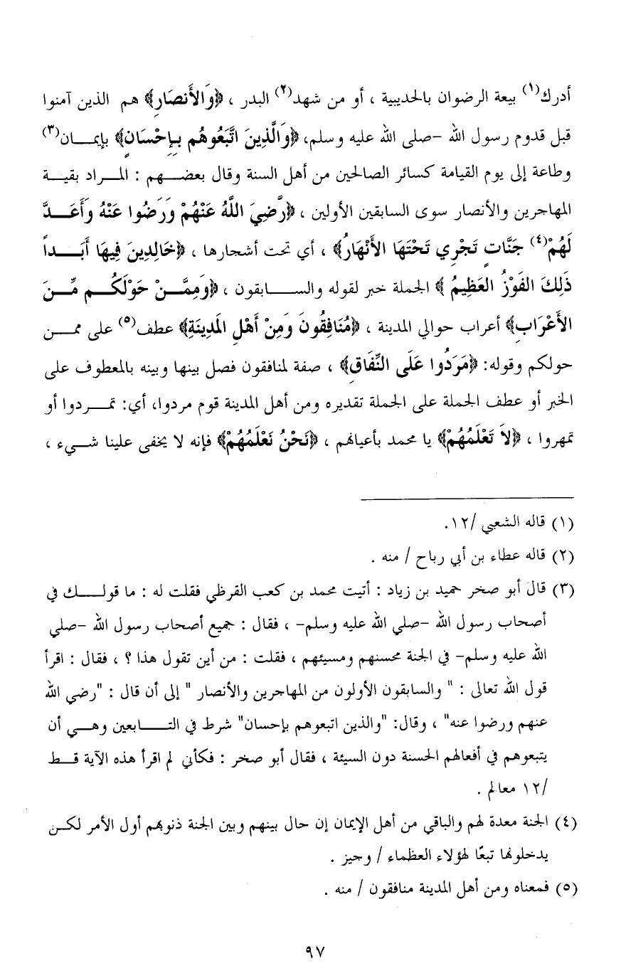 أدرك بيعة الرضوان بالحديبية، أو من شَهد البدر، (وَالأَنصَارِ) هم الذين آمنوا قبل قدوم رسول الله - صلى الله عليه وسلم، (وَالَّذِينَ اتَّبَعُوهُم بِإِحْسَانٍ) بإيمان وطاعة إلى يوم القيامة كسائر الصالحين من أهل السنة وقال بعضهم: المراد بقية المهاجرين والأنصار سوى السابقين الأولين، (رَضِيَ اللهُ عَنْهُمْ وَرَضُوا عَنْهُ وَأَعَدَّ لَهُمْ جَنَّاتٍ تَجْرِي تَحْتَهَا الْأَنْهَارُ)، أي تحت أشجارها، (خَالِدِينَ فِيهَا أَبَدًا ذَلِكَ الْفَوْزُ الْعَظِيمُ) الجملة خبر لقوله والسابقون، (وَمِمَّنْ حَوْلَكُم مِّنَ الأَعْرَابِ) أعراب حوالي المدينة، (مُنَافِقُونَ وَمِنْ أَهْلِ الْمَدِينَةِ) عطف على ممن حولكم وقوله: (مَرَدُوا عَلَى النِّفَاقِ)، صفة لمنافقون فصل بينها وبينه بالمعطوف على الخبر أو عطف الجملة على الجملة تقديره ومن أهل المدينة قوم مردوا، أي: تمردوا أو تمهروا، (لاَ تَعْلَمُهُمْ) يا محمد بأعيانهم، (نَحْنُ نَعْلَمُهُمْ) فإنه لا يخفى علينا شيء،