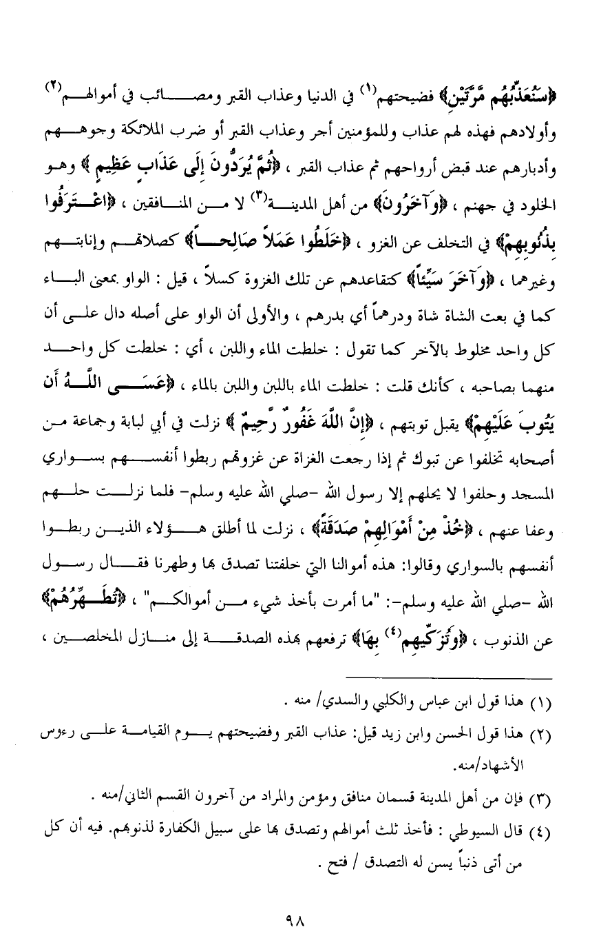 (سَنُعَذِّبُهُمْ مَرَّتَيْنِ) فضيحتهم في الدنيا وعذاب القبر ومصائب في أموالهم وأولادهم فهذه لهم عذاب وللمؤمنين أجر وعذاب القبر أو ضرب الملائكة وجوههم وأدبارهم عند قبض أرواحهم ثم عذاب القبر، (ثُمَّ يُرَدُّونَ إِلَى عَذَابٍ عَظِيمٍ) وهو الخلود في جهنم، (وَآخَرُون) من أهل المدينة لا من المنافقين، (اعْتَرَفُوا بِذُنُوبِهِمْ) في التخلف عن الغزو، (خَلَطُوا عَمَلًا صَالِحًا) كصلاتهم وإنابتهم وغيرهما، (وَآخَرَ سَيِّئًا) كتقاعدهم عن تلك الغزوة كسلاً، قيل: الواو بمعنى الباء كما في بعت الشاة شاة ودرهماً أي بدرهم، والأولى أن الواو على أصله دال على أن كل واحد مخلوط بالآخر كما تقول: خلطت الماء واللبن، أي: خلطت كل واحد منهما بصاحبه، كأنك قلت: خلطت الماء باللبن واللبن بالماء، (عَسَى اللهُ أَنْ يَتُوبَ عَلَيْهِمْ) يقبل توبتهم، (إِنَّ اللهَ غَفُورٌ رَحِيمٌ) نزلت في أبي لبابة وجماعة من أصحابه تخلفوا عن تبوك ثم إذا رجعت الغزاة عن غزوتهم ربطوا أنفسهم بسواري المسجد وحلفوا لا يحلهم إلا رسول الله - صلى الله عليه وسلم - فلما نزلت حلهم وعفا عنهم، (خُذْ مِنْ أَمْوَالِهِمْ صَدَقَةً)، نزلت لما أطلق هؤلاء الذين ربطوا أنفسهم بالسوارى وقالوا: هذه أموالنا التي خلفتنا تصدق ها وطهرنا فقال رسول الله - صلي الله عليه وسلم -: " ما أمرت بأخذ شيء من أموالكم "، (تطَهِّرُهُمْ) عن الذنوب، (وَنُزكِّيهِم بِهَا) ترفعهم بهذه الصدقة إلى منازل المخلصين،