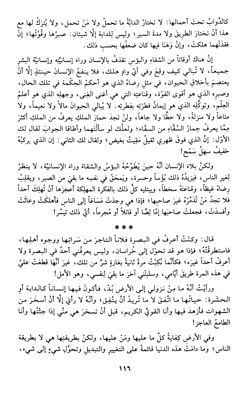 إن هناك أوقاتا من الشقاء والبؤس تقذف بالإنسان وراء إنسانيته وإنسانية البشر جميعا، لا تبالي كيف وقع وفي أي واد هلك، فلا ينفع الإنسان حينئذ إلا أن يعتصم بأخلاق الحيوان في مثل رضاه الذي هو أحكم الحكمة في تلك الحال، وصبره الذي هو أقوى القوة، وقناعته التي هي أغنى الغنى، وجهله الذي هو أعلم العلم، وتوكله الذي هو إيمان فطرته بفطرته، لا يبالي الحيوان مالا ولا نعيما، ولا متاعا ولا منزلة، ولا حظا ولا جاها، ولن تجد حمار الملك يعرف من الملك أكثر مما يعرف حمار السقاء من السقاء، ولعلك لو سألتهما وأطاقا الجواب لقال لك الأول: إن الذي فوق ظهري ثقيل مقيت بغيض؛ ولقال لك الثاني: إن الذي يركبه خفيف سهل سمح!