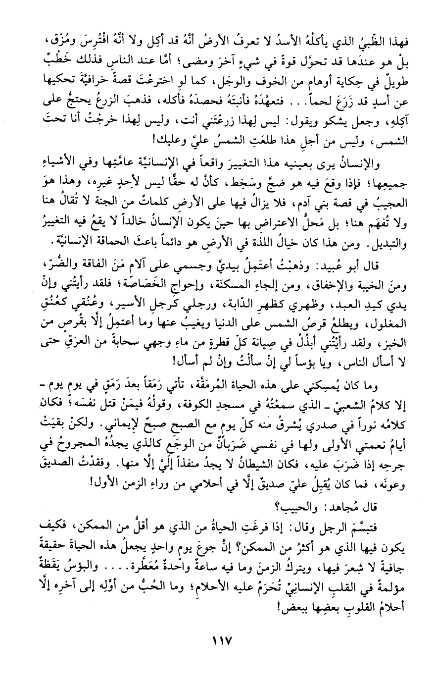 وما كان يمسكني على هذه الحياة المرمقة، تأتي رمقا بعد رمق في يوم يوم -إلا كلام الشعبي- الذي سمعته في مسجد الكوفة، وقوله فيمن قتل نفسه؛ فكان كلامه نورا في صدري يشرق منه كل يوم مع الصبح صبح لإيماني. ولكن بقيت أيام نعمتي الأولى ولها في نفسي ضربان من الوجع كالذي يجده المجروح في جرحه إذا ضرب عليه، فكان الشيطان لا يجد منفذا إلي إلا منها. وفقدت الصديق وعونه، فما كان يقبل على صديق إلا في أحلامي من وراء الزمن الأول!