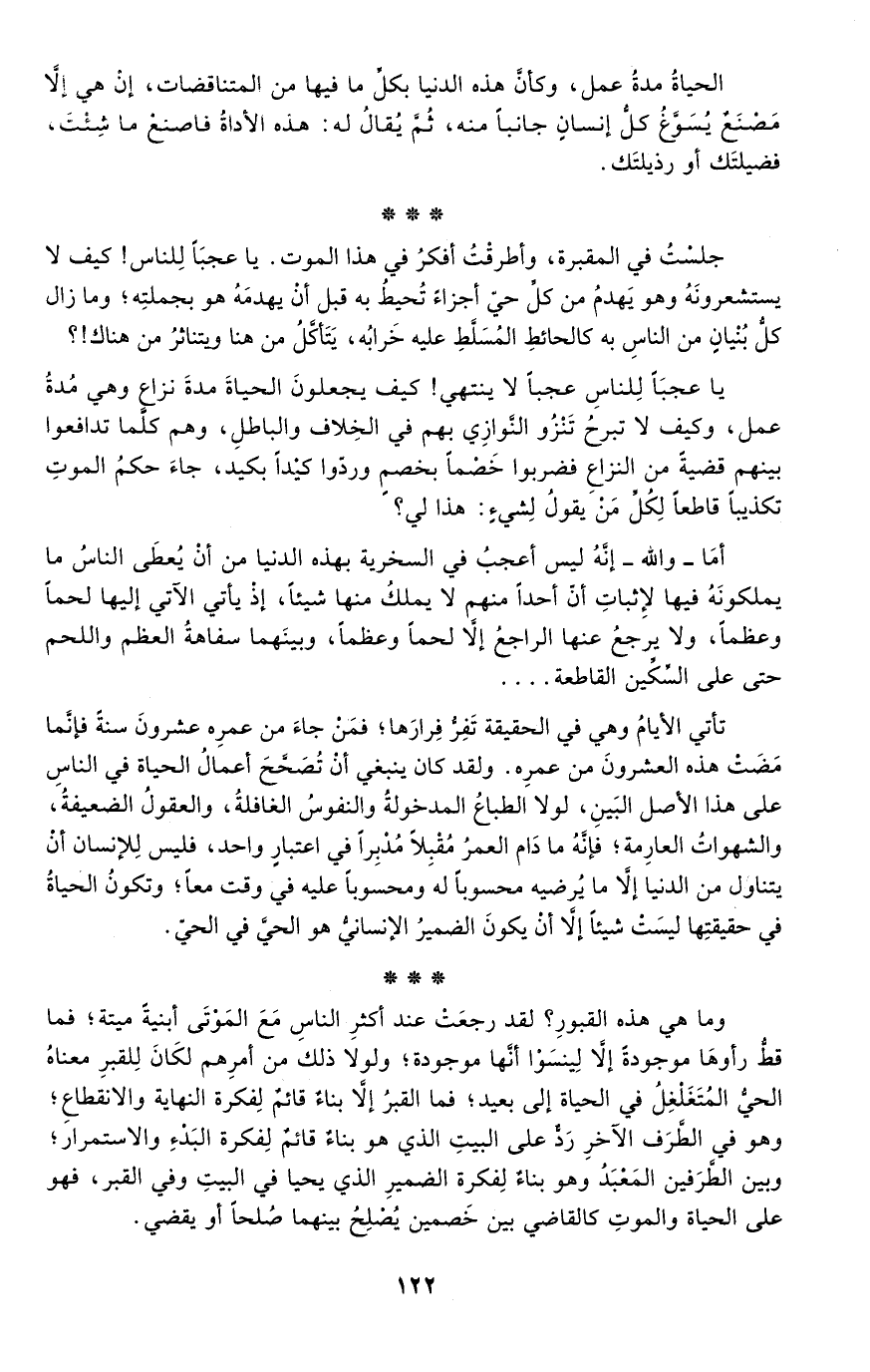 جلست في المقبرة، وأطرقت أفكر في هذا الموت. يا عجبا للناس! كيف لا يستشعرونه وهو يهدم من كل حي أجزاء تحيط به قبل أن يهدمه هو بجملته؛ وما زال كل بنيان من الناس به كالحائط المسلط عليه خرابه، يتأكل من هنا ويتناثر من هناك!